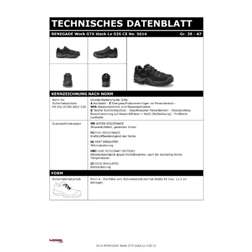 | Variante: | LOWA Sicherheitshalbschuh RENEGADE Work GTX black Lo S3S CI, Gr. 46 |