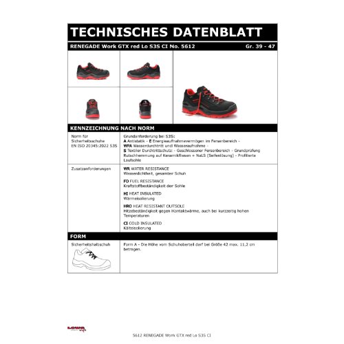 Eigenschaften "LOWA Sicherheitshalbschuh RENEGADE Work GTX red Lo S3S CI, Gr. 41"