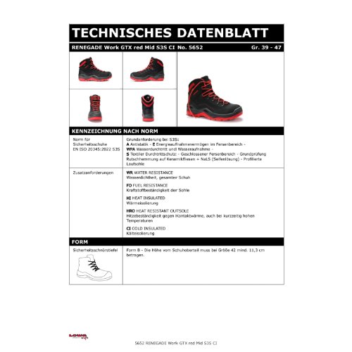 Eigenschaften "LOWA Sicherheitsschnürstiefel RENEGADE Work GTX red Mid S3S CI, Gr. 47"