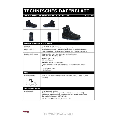 Eigenschaften "LOWA Sicherheitsstiefel LARROX Work GTX black-blue Mid S3 CI, Gr. 43"