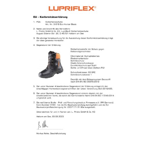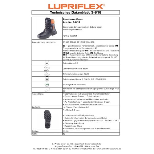 Eigenschaften "Lupriflex Schnittschutzstiefel Class 1 Eco-Hunter Basic S3 Gr. 45"