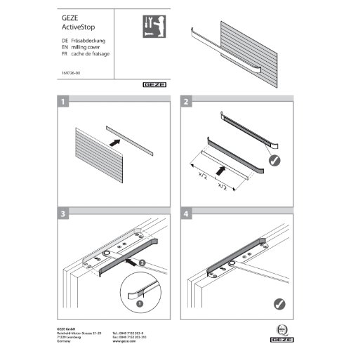 | Variante: | GEZE OT-Fräsabdeckung, ActiveStop, für Gleitschiene, DIN Links-Rechts,Anwend. Türbl. |
