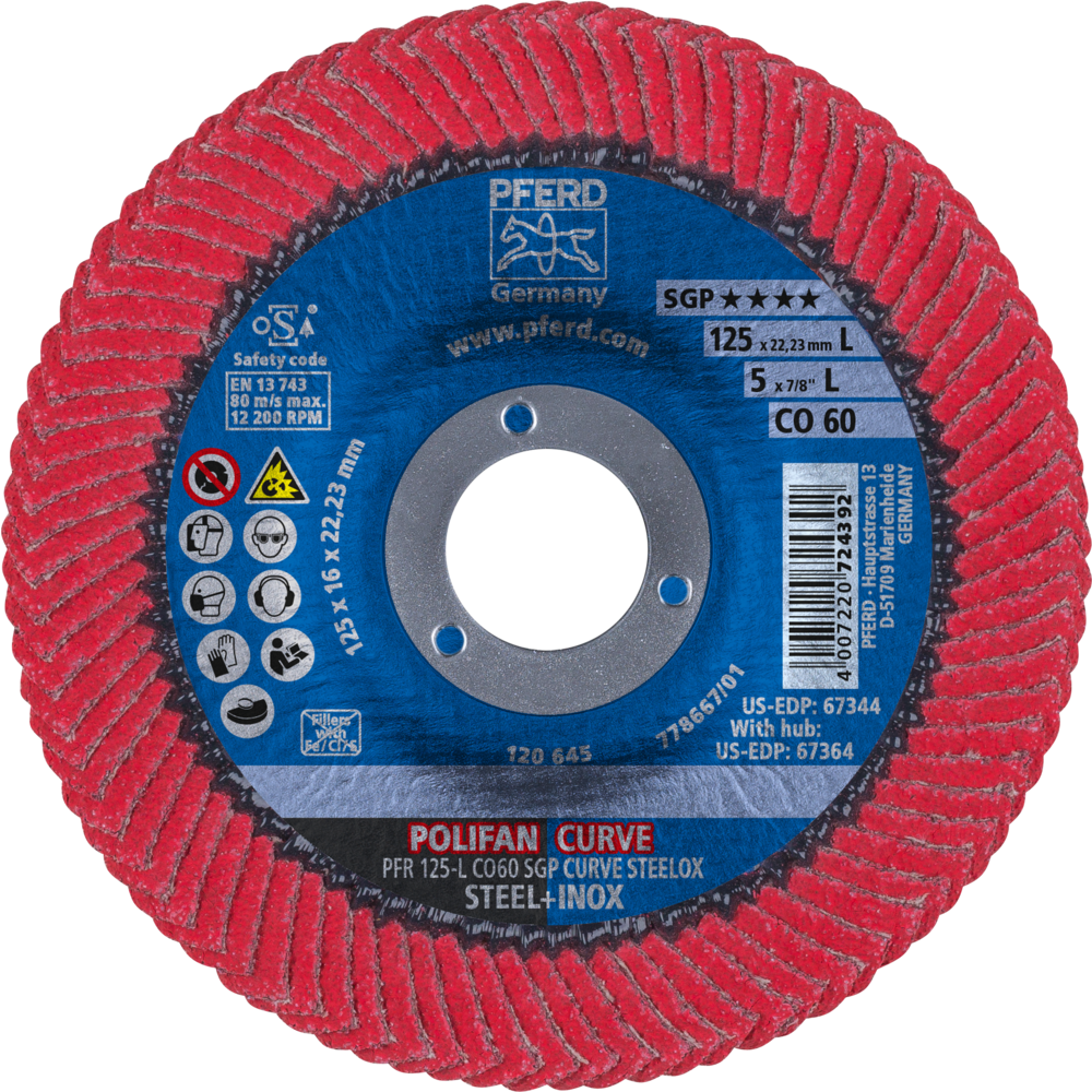 Werkzeuge der Spezial-Linie SGP sind speziell für besondere Aufgabenstellungen entwickelt und bieten dem Anwender entscheidende Vorteile gegenüber herkömmlichen Produkten. Weiter umfasst die Spezial-Linie SGP Werkzeuge, die aufgrund ihrer besonders hohen Leistung im Einsatz ultimative Wirtschaftlichkeit bieten. Die Fächerscheibe POLIFAN-CURVE wurde speziell für die Kehlnahtbearbeitung entwickelt. Sie ist die weltweit einzige Fächerscheibe, die sowohl auf der Schleifseite als auch auf der Rückseite sowie am Radius mit Lamellen belegt ist. Die POLIFAN CURVE von PFERD ist in vielen Ländern der Welt patentiert. Hochleistungsfächerscheibe zur Erzielung feiner Oberflächen auf Stahl und Edelstahl (INOX). te L CO60 SGP STEELOX für Stahl/Edelstahl
