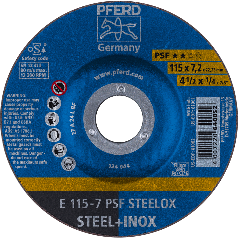 Das Einstiegsprogramm der Universal-Linie PSF beinhaltet solide Werkzeuge für die Bearbeitung der gängigsten Werkstoffe. Werkzeuge der Universal-Linie PSF erzielen gute Arbeitsergebnisse bei hoher Wirtschaftlichkeit. Schruppscheibe für Stahl und Edelstahl (INOX) mit hoher Schleiffreudigkeit und guter Standzeit. PSF STEELOX für Stahl/Edelstahl