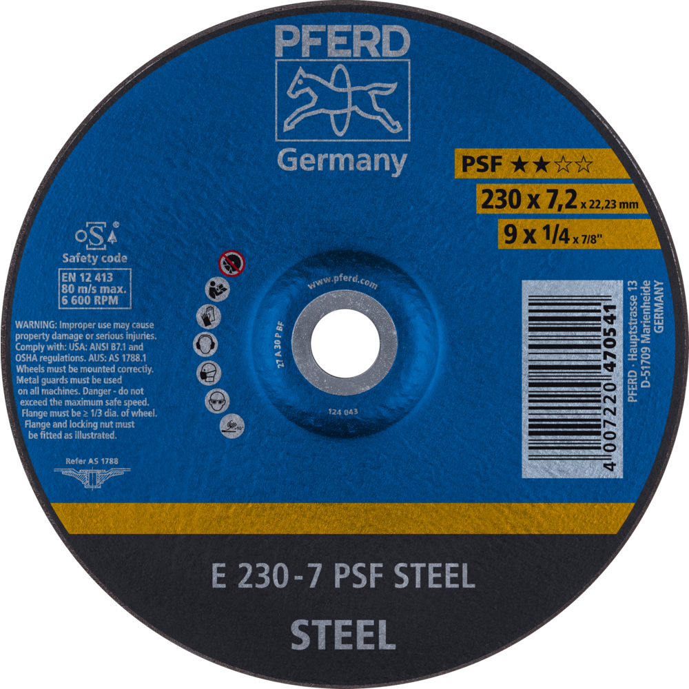 Eigenschaften "Pferd Schruppscheibe E 230x7,2x22,23 mm Universallinie PSF STEEL für Stahl"