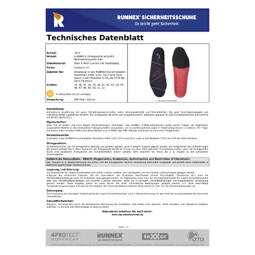 Einlegesohle RUNNEX® activeFit-Mehrweitensystem slim Material: Titan X-MAX Cushion mit Textilbezug. Geeignet für ESD Sicherheitsschuhe. Farbe: schwarz / rot Konform mit EN ISO 20345:2011 Antistatische Ausführung mit guten Dämpfungseigenschaften, hoher Atmungsaktivität und Rückstelleffekt. Die gute Feuchtigkeitsabgabe und -aufnahme bietet zusätzlichen Komfort. Die Sohle ist leicht und umweltfreundlich. Material: Titan X-MAX Cushion mit Textilbezug Einsatzgebiete: Einsetzbar in den RUNNEX-Schuhmodellen TeamStars 5309, 5310, 5313 und 5314, sowie in den Modellen 5178 und 5370 der Serie FlexStars.