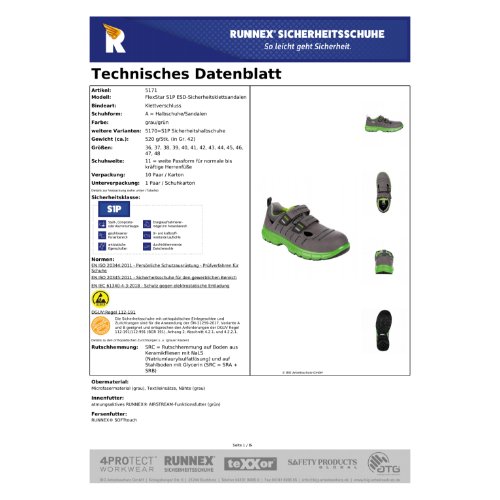 Eigenschaften "RUNNEX® S1P-ESD-Sicherheitsklettsandalen FlexStar 44, grau/grün"