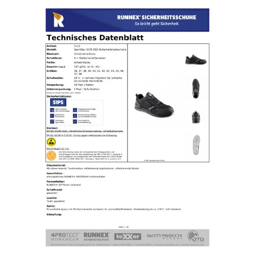 | Normen: | EN ISO 20345:2022 S1PS FO, EN 61340-5-1:2016, DGUV112-191 |