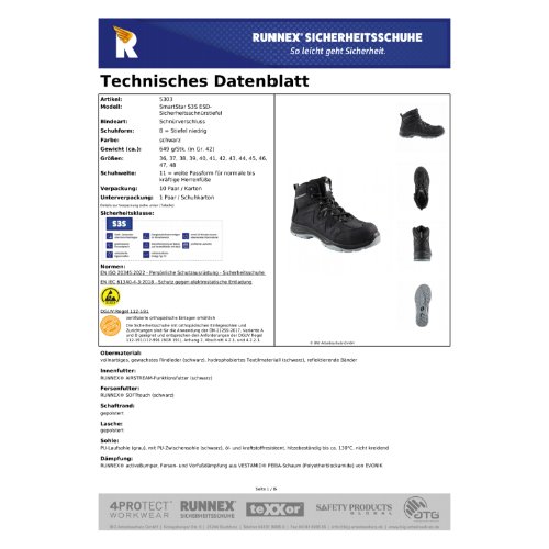 Normen: EN ISO 20345:2022 S3S FO, EN 61340-5-1:2016, DGUV112-191