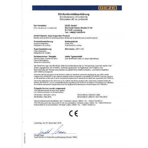 | Variante: | GEZE RWA-Elektrokettenantrieb, Slimchain, 230V AC, Hub max. 200mm, DR,RAL 9016 |