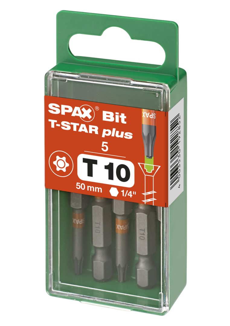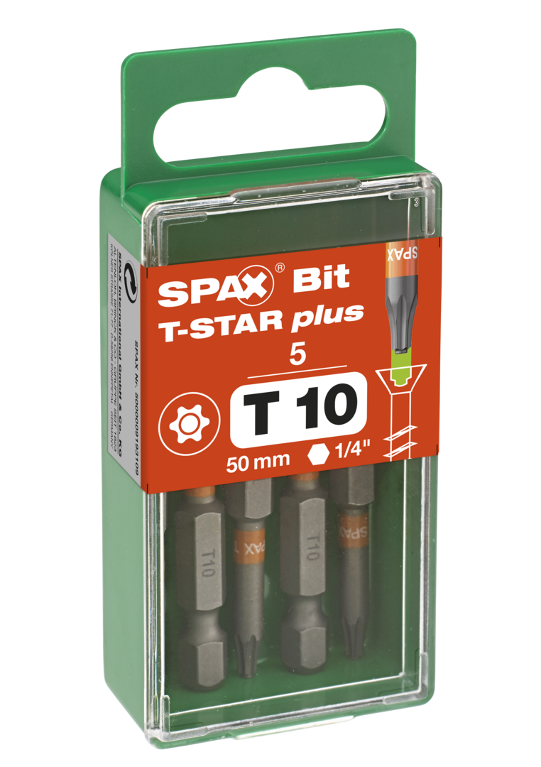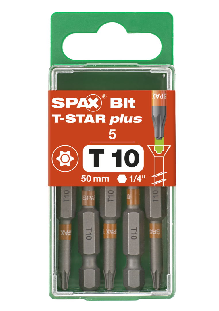 Passend zu unserem SPAX Sortiment mit T-STAR plus Kraftangriff bieten wir exakt auf unsere Schrauben abgestimmte SPAX Bits in T-STAR plus-Ausführung, gut erkennbar an der orangenen Farbcodierung. Die Bits gibt es in den Klingengro¨ßen T10 bis T50. Durch die SPAX Bits T-STAR plus erreichen Sie eine bessere Kraftu¨bertragung durch perfekten Passsitz, eine ho¨here Standzeit und ein schnelleres Einfa¨deln. Der saubere Sitz des Bits bedeutet zudem eine bessere Fu¨hrung, etwa bei Verschraubungen u¨ber Kopf. Die SPAX T-Star plus Bits erkennen Sie an der orangenen Farbmarkierung, die Klingengröße ist anhand der entsprechenden Aufdrucks sowie der Prägung ersichtlich. Die La¨nge unserer kurzen SPAX Bits T-STAR plus liegt bei 25 mm. Das perfekt aufeinander abgestimmte System T-Star plus, bestehend aus Schraube und Bit, bietet Ihnen immer das optimale Schrauberlebnis.