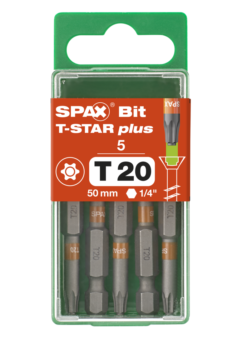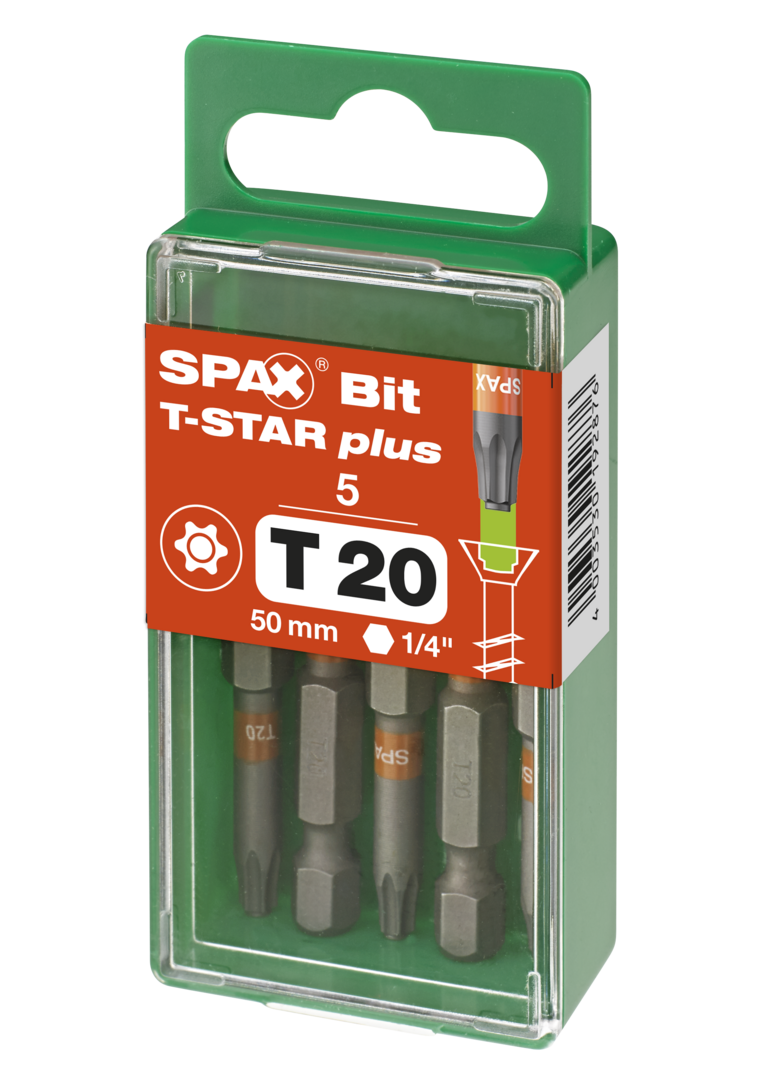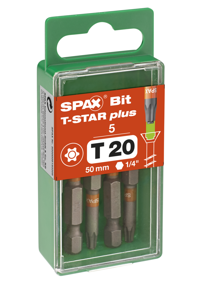 Passend zu unserem SPAX Sortiment mit T-STAR plus Kraftangriff bieten wir exakt auf unsere Schrauben abgestimmte SPAX Bits in T-STAR plus-Ausführung, gut erkennbar an der orangenen Farbcodierung. Die Bits gibt es in den Klingengro¨ßen T10 bis T50. Durch die SPAX Bits T-STAR plus erreichen Sie eine bessere Kraftu¨bertragung durch perfekten Passsitz, eine ho¨here Standzeit und ein schnelleres Einfa¨deln. Der saubere Sitz des Bits bedeutet zudem eine bessere Fu¨hrung, etwa bei Verschraubungen u¨ber Kopf. Die SPAX T-Star plus Bits erkennen Sie an der orangenen Farbmarkierung, die Klingengröße ist anhand der entsprechenden Aufdrucks sowie der Prägung ersichtlich. Die La¨nge unserer kurzen SPAX Bits T-STAR plus liegt bei 25 mm. Das perfekt aufeinander abgestimmte System T-Star plus, bestehend aus Schraube und Bit, bietet Ihnen immer das optimale Schrauberlebnis.