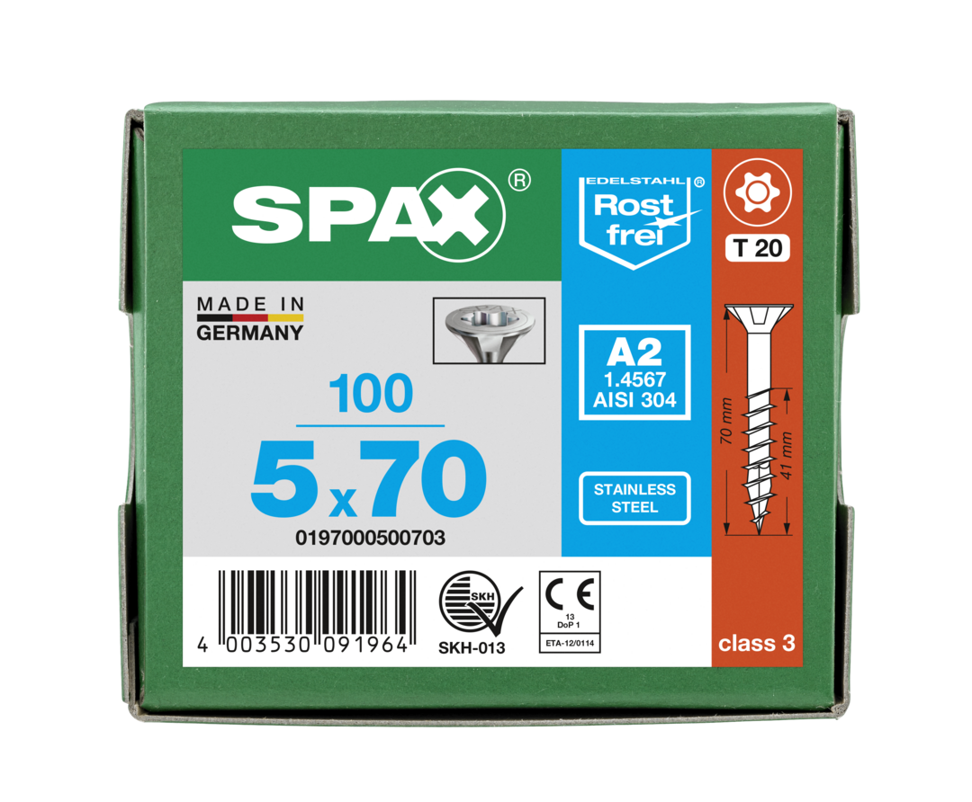 Variante: | SPAX Edelstahlschraube, 5 x 70 mm, 100 Stück, Teilgewinde, Senkkopf, T-STAR plus T20, 4CUT, Edelstahl rostfrei A2 - 0197000500703 |