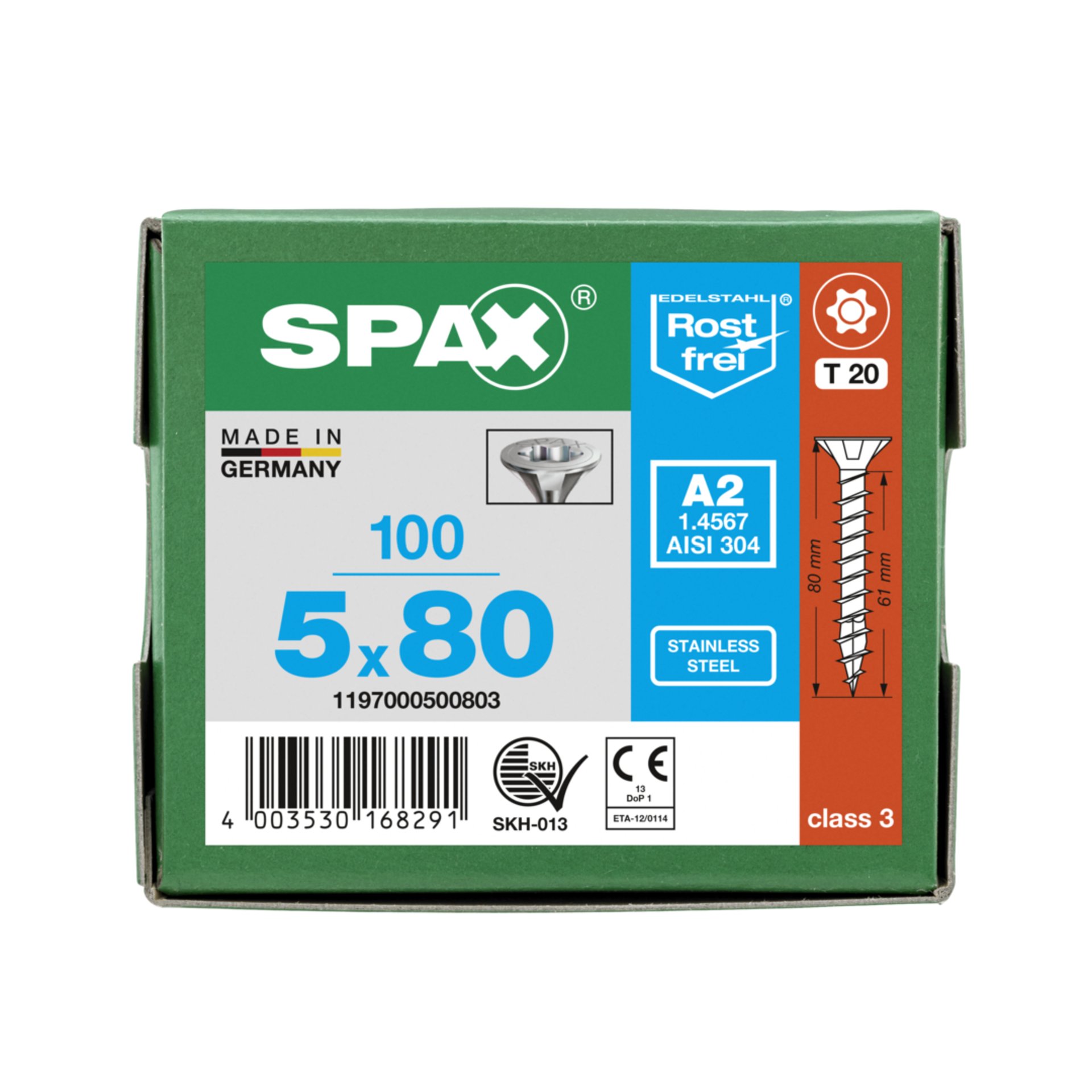 Eigenschaften "SPAX Edelstahlschraube, 5 x 80 mm, 100 Stück, Vollgewinde, Senkkopf, T-STAR plus T20, 4CUT, Edelstahl rostfrei A2"