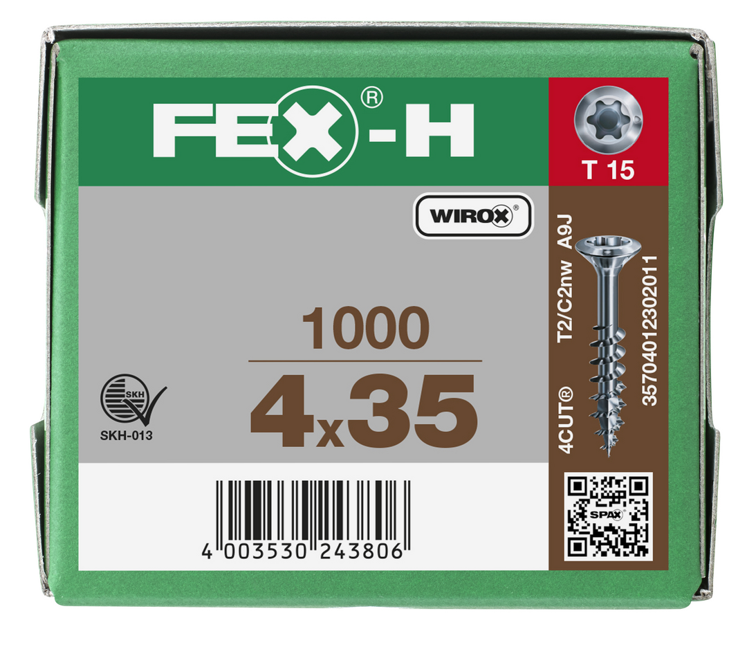 Eigenschaften "SPAX FEX-H, 4 x 35 mm, 1000 Stück, Teilgewinde, Senkkopf, T-STAR plus T15, 4CUT, WIROX"