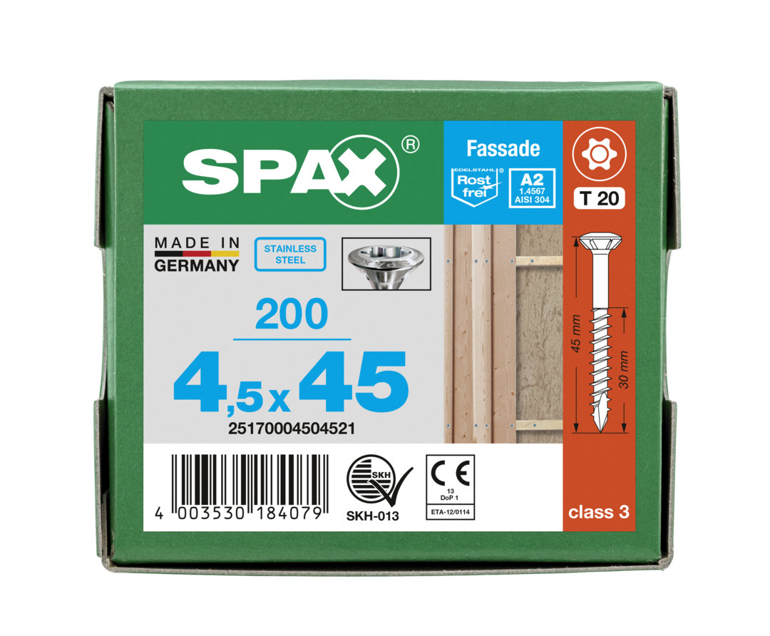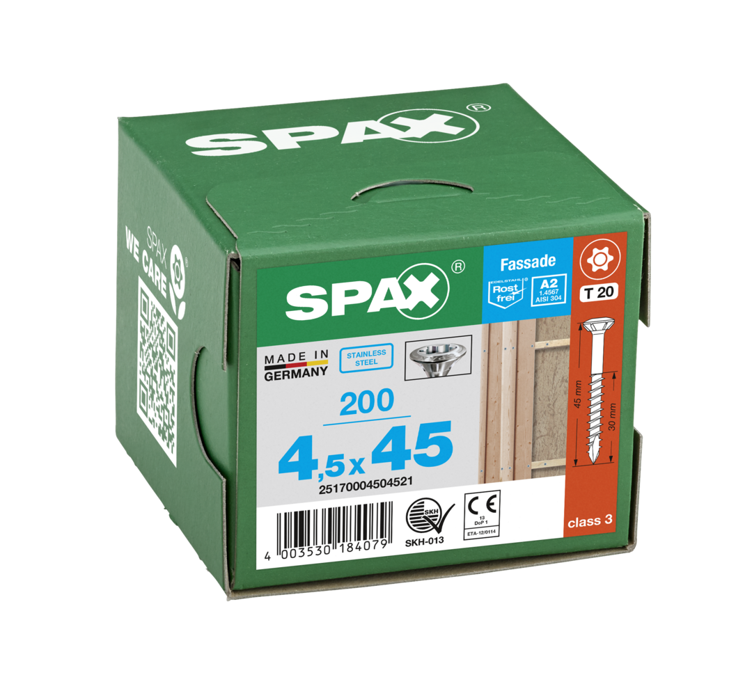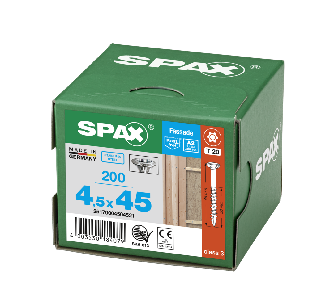 Eigenschaften "SPAX Fassadenschraube, 4,5 x 45 mm, 200 Stück, Teilgewinde, Linsensenkkopf, T-STAR plus T20, CUT-Spitze, Edelstahl rostfrei A2"