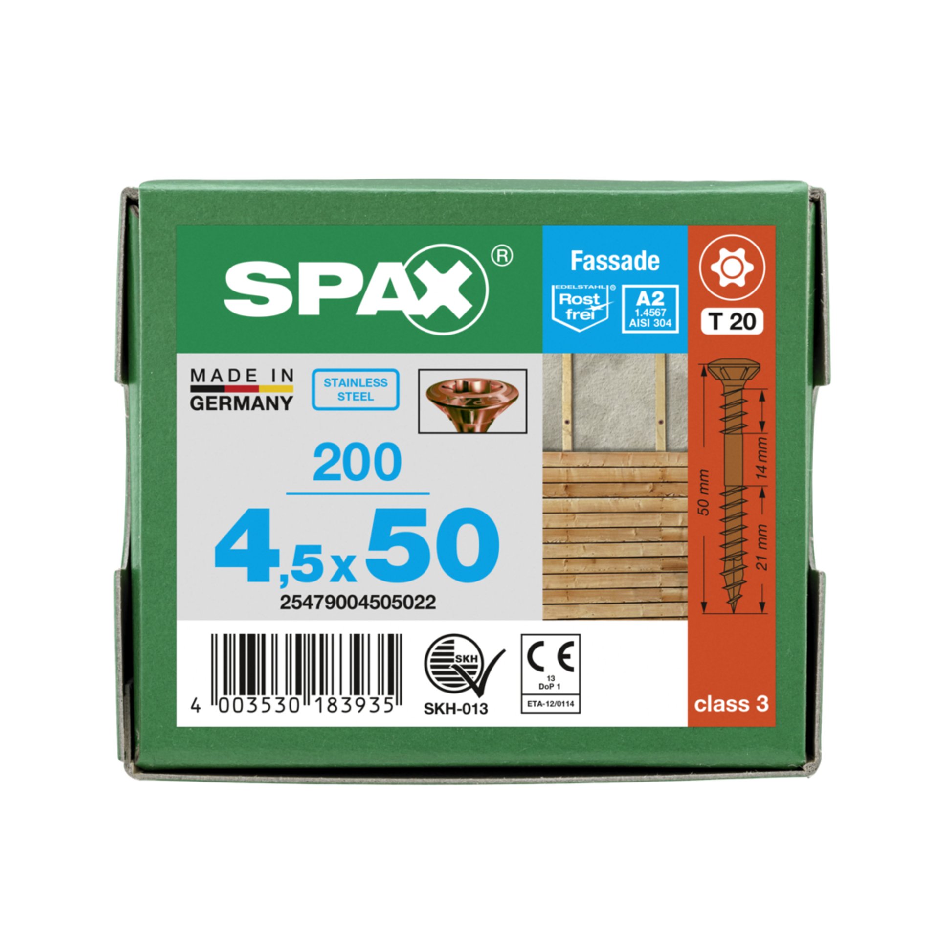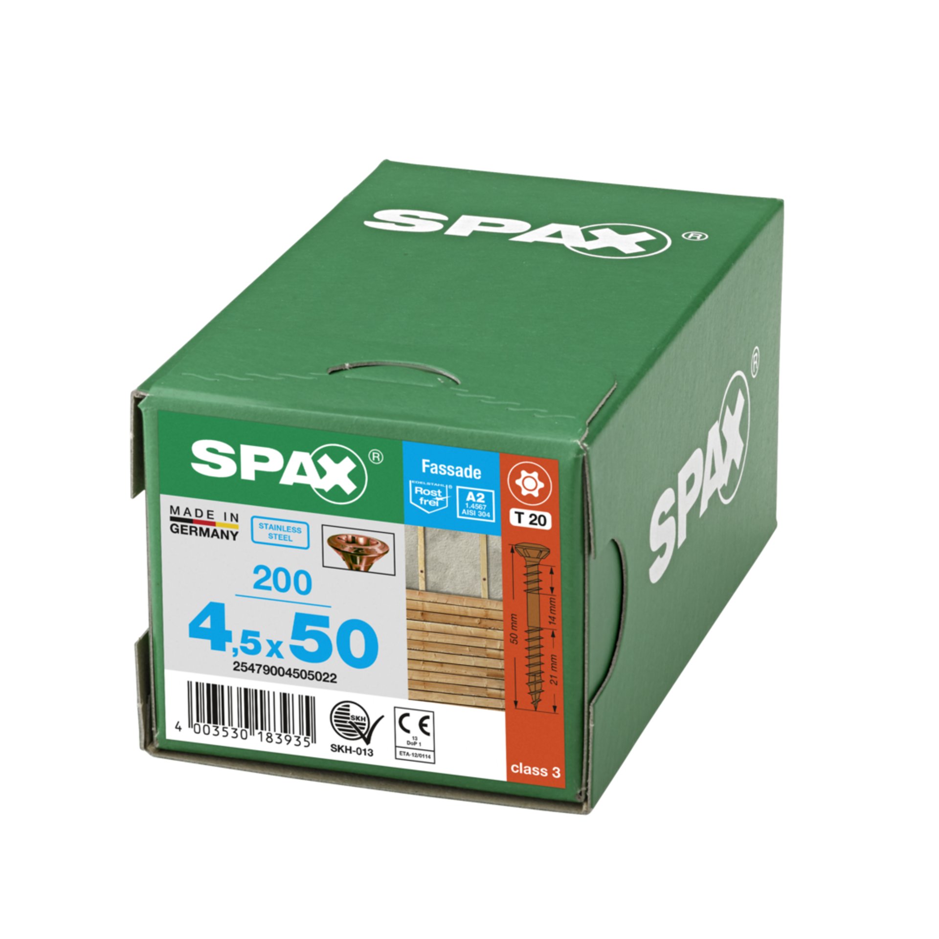 SPAX Fassadenschraube, 4,5 x 50 mm, 200 Stück, Fixiergewinde, Linsensenkkopf, T-STAR plus T20, 4CUT, Edelstahl rostfrei A2 antik