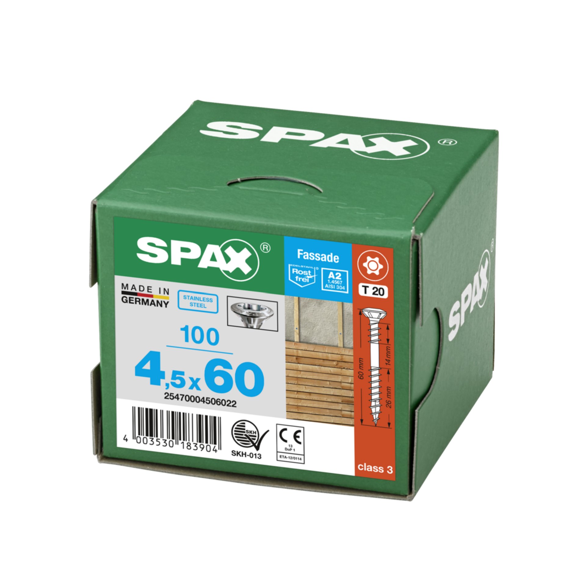 Eigenschaften "SPAX Fassadenschraube, 4,5 x 60 mm, 100 Stück, Fixiergewinde, Linsensenkkopf, T-STAR plus T20, 4CUT, Edelstahl rostfrei A2"