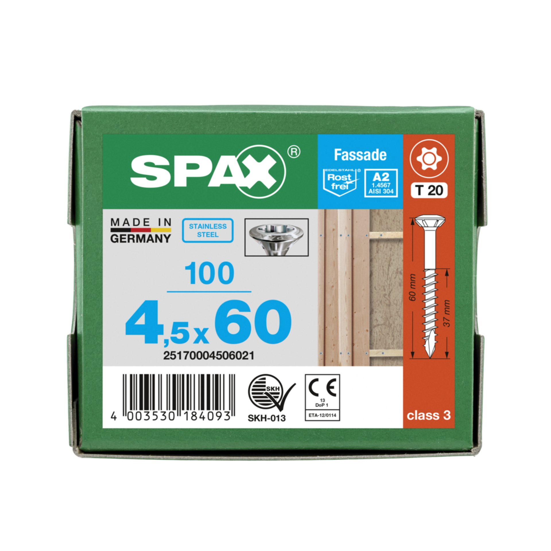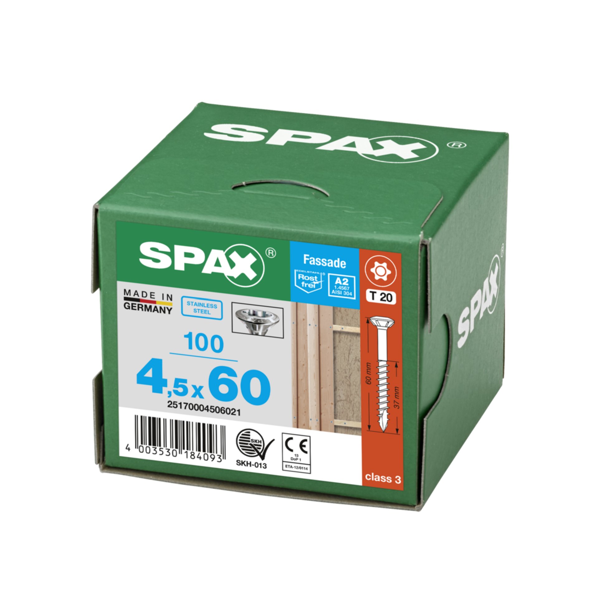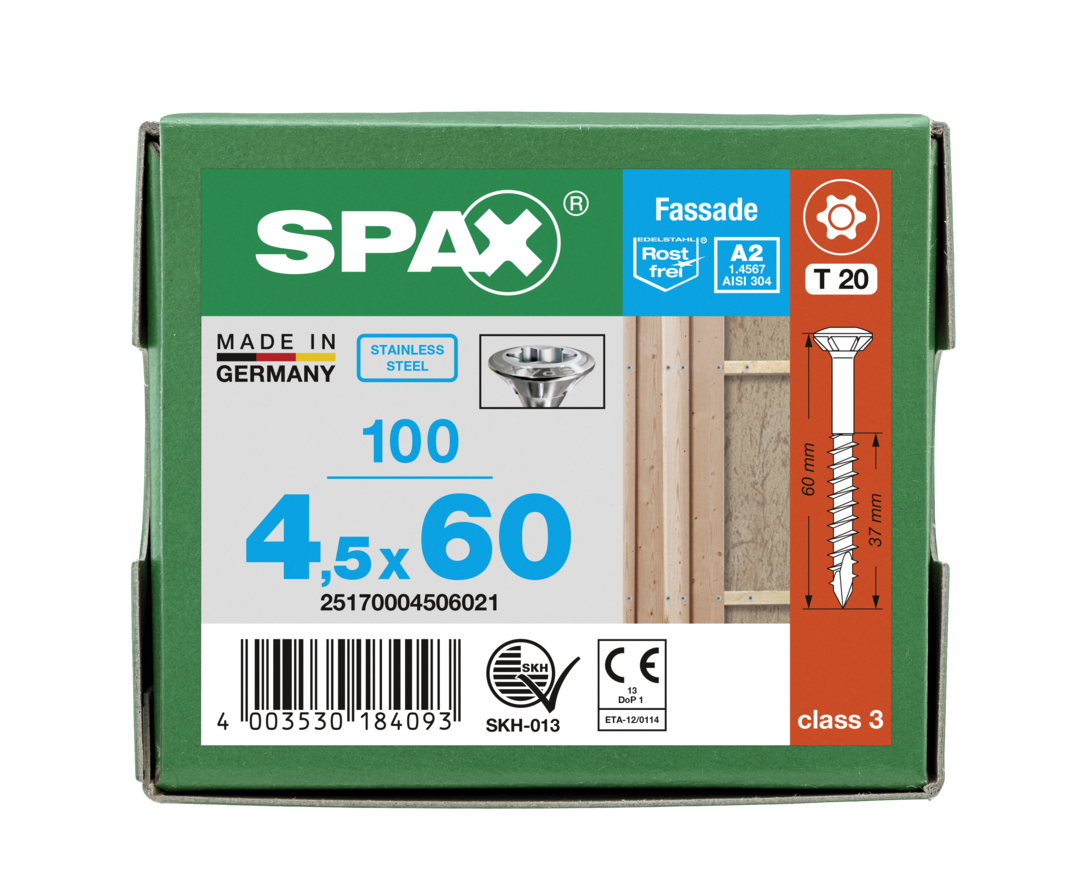Eigenschaften "SPAX Fassadenschraube, 4,5 x 60 mm, 100 Stück, Teilgewinde, Linsensenkkopf, T-STAR plus T20, CUT-Spitze, Edelstahl rostfrei A2"
