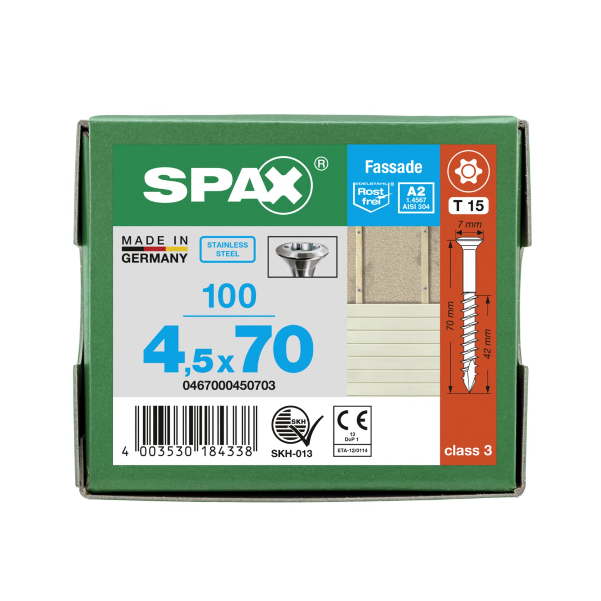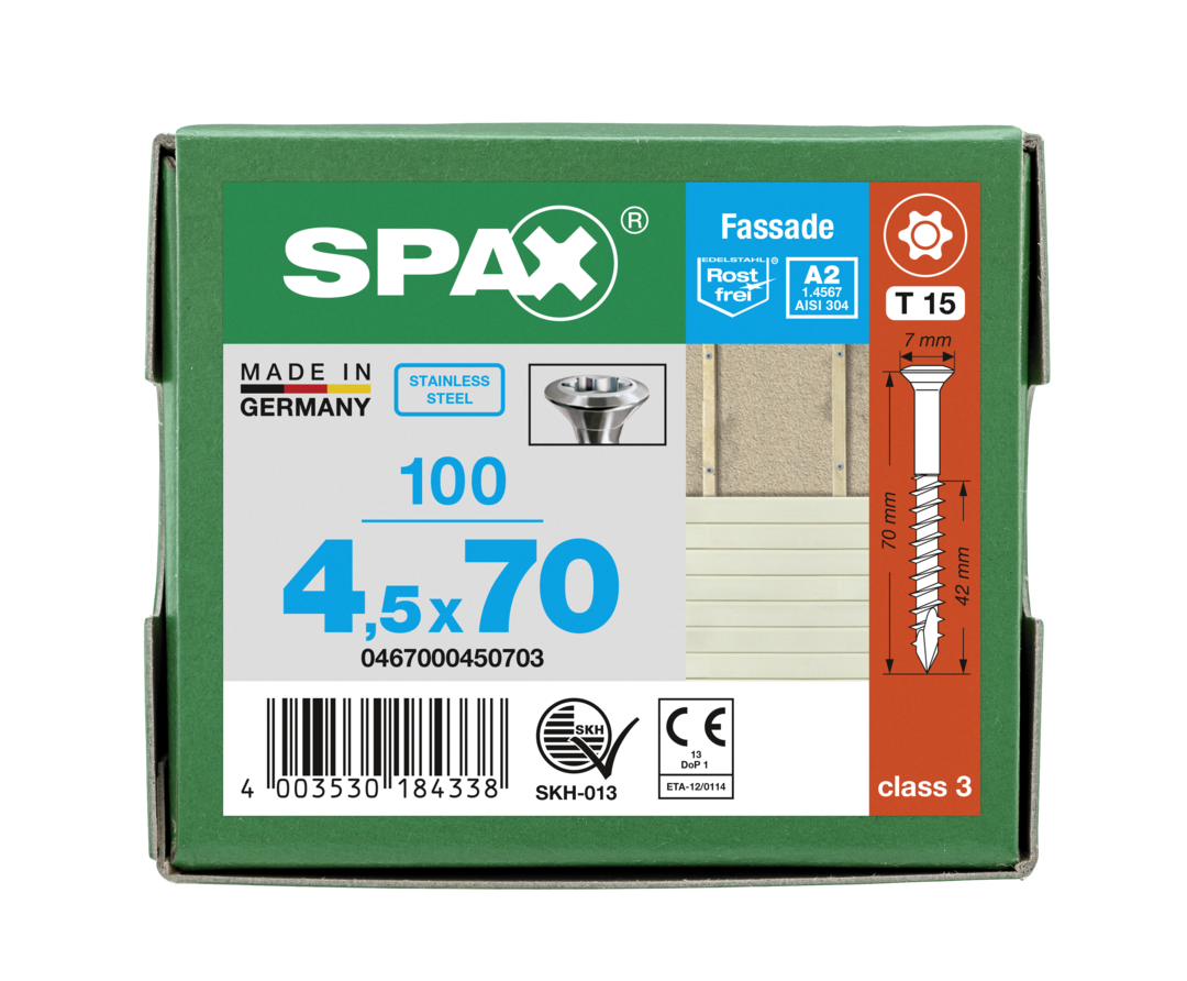 Eigenschaften "SPAX Fassadenschraube, 4,5 x 70 mm, 100 Stück, Teilgewinde, Linsensenkkopf extra klein, T-STAR plus T15, CUT-Spitze, Edelstahl rostfrei A2"