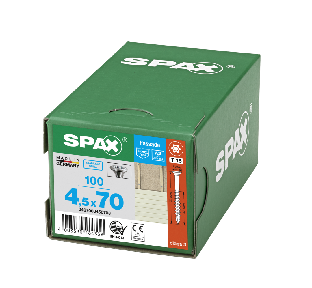 SPAX Fassadenschraube, 4,5 x 70 mm, 100 Stück, Teilgewinde, Linsensenkkopf extra klein, T-STAR plus T15, CUT-Spitze, Edelstahl rostfrei A2