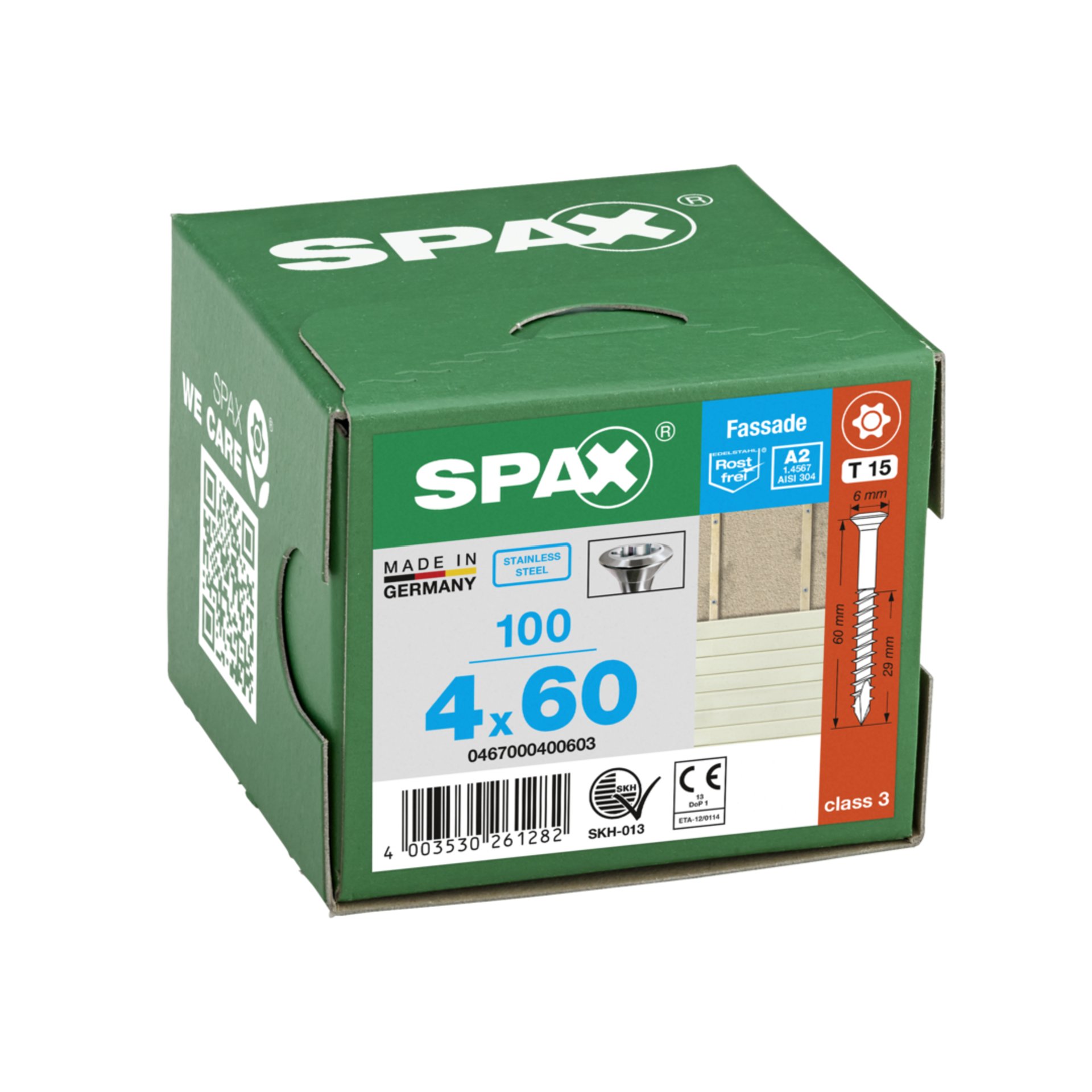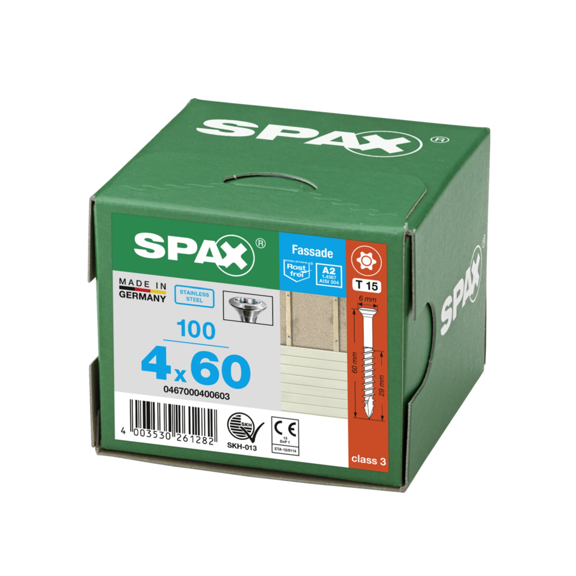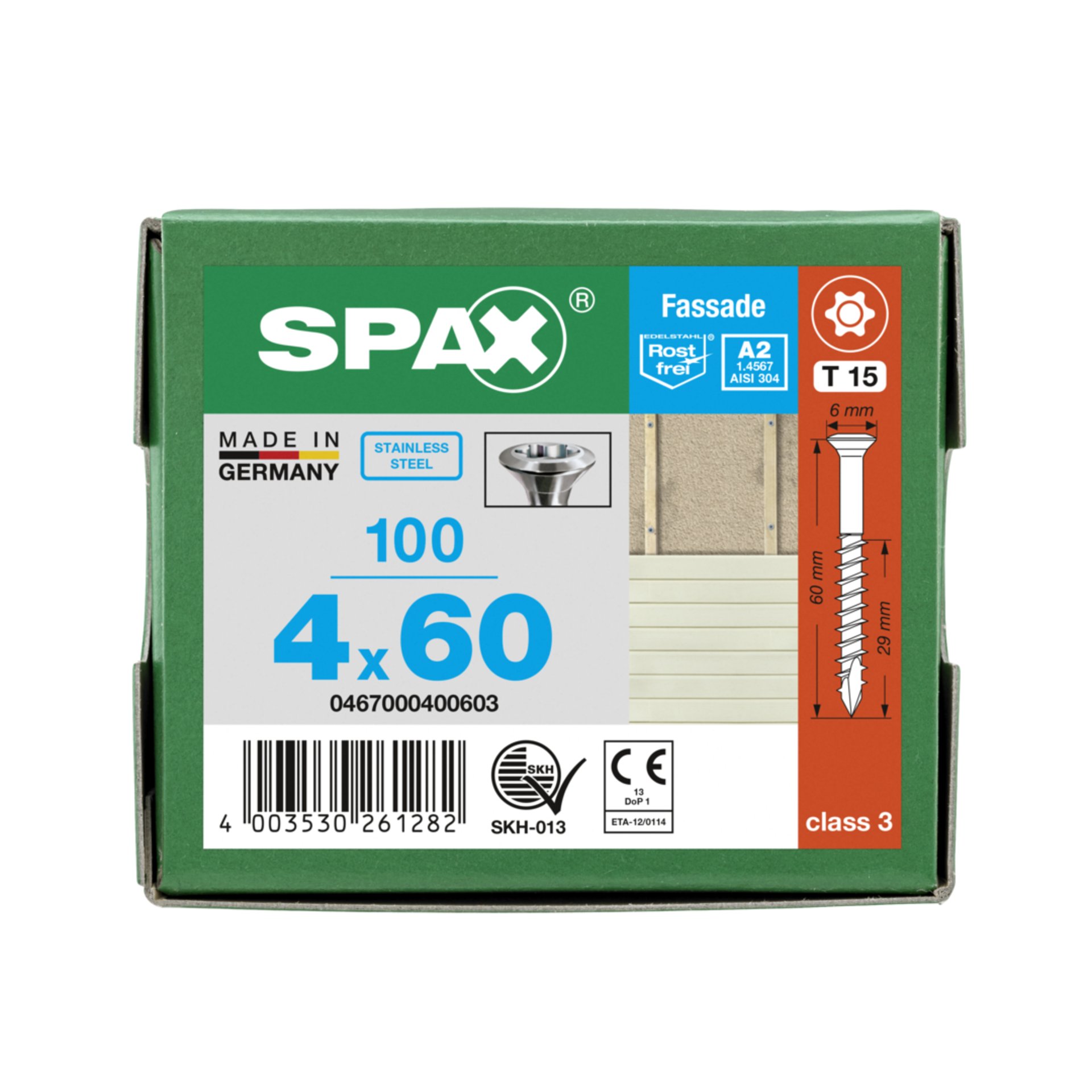 SPAX Fassadenschraube, 4 x 60 mm, 100 Stück, Teilgewinde, Linsensenkkopf extra klein, T-STAR plus T15, CUT-Spitze, Edelstahl rostfrei A2