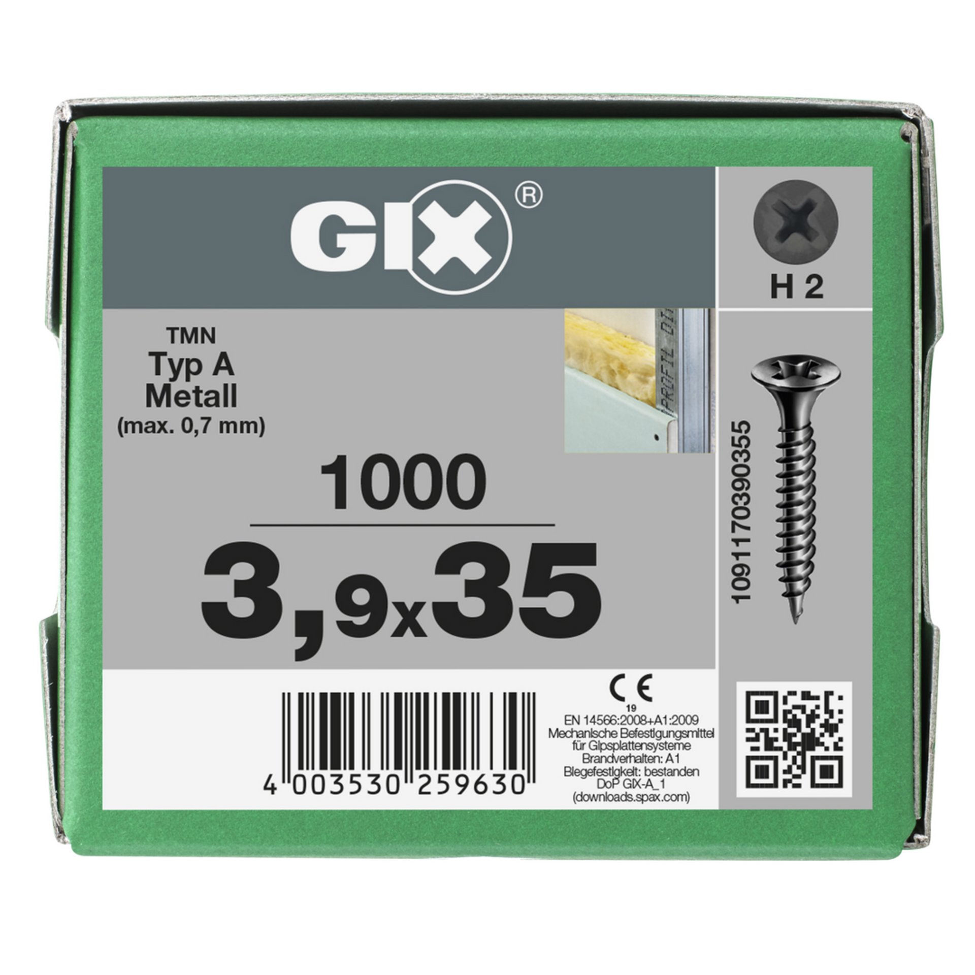 SPAX GIX-A Feingewinde, 3,9 x 35 mm, 1000 Stück, Vollgewinde, Trompetenkopf, Kreuzschlitz H2, Nadelspitze, Phosphatiert schwarz