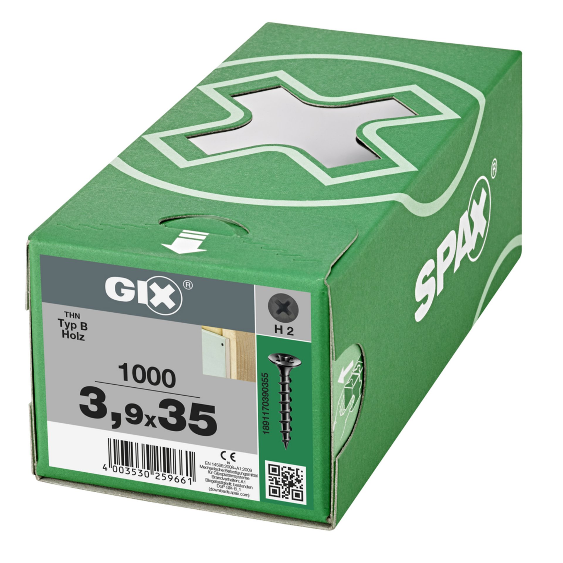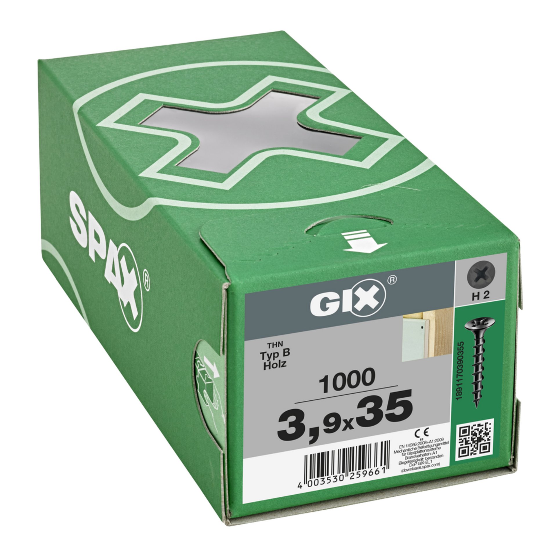 Produktinformationen "SPAX GIX-B Grobgewinde, 3,9 x 35 mm, 1000 Stück, Vollgewinde, Trompetenkopf, Kreuzschlitz H2, Nadelspitze, Phosphatiert schwarz"