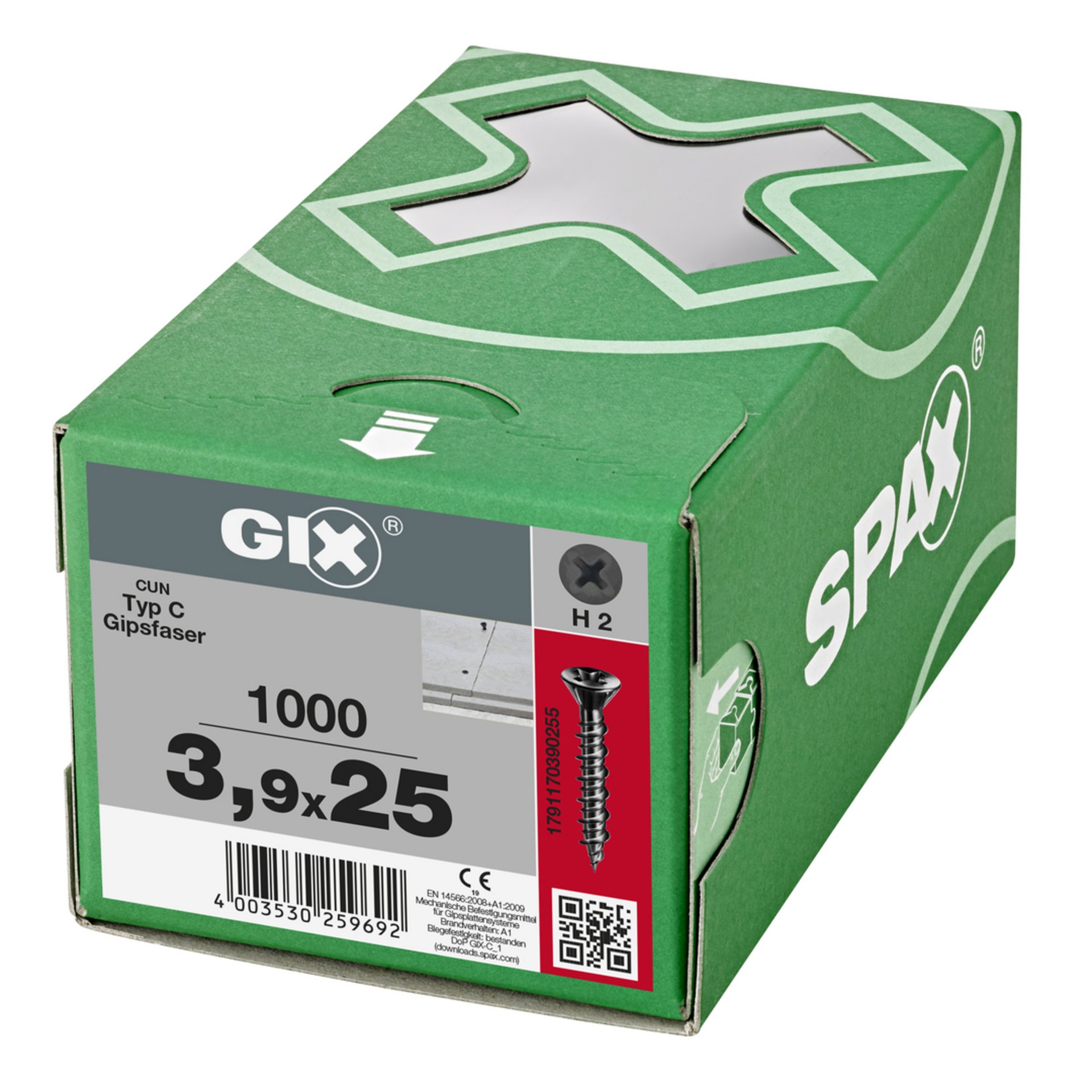 Produktinformationen "SPAX GIX-C für Gipsfaser, 3,9 x 25 mm, 1000 Stück, Vollgewinde, Spitzer Fräskopf, Kreuzschlitz H2, Nadelspitze, Phosphatiert schwarz"