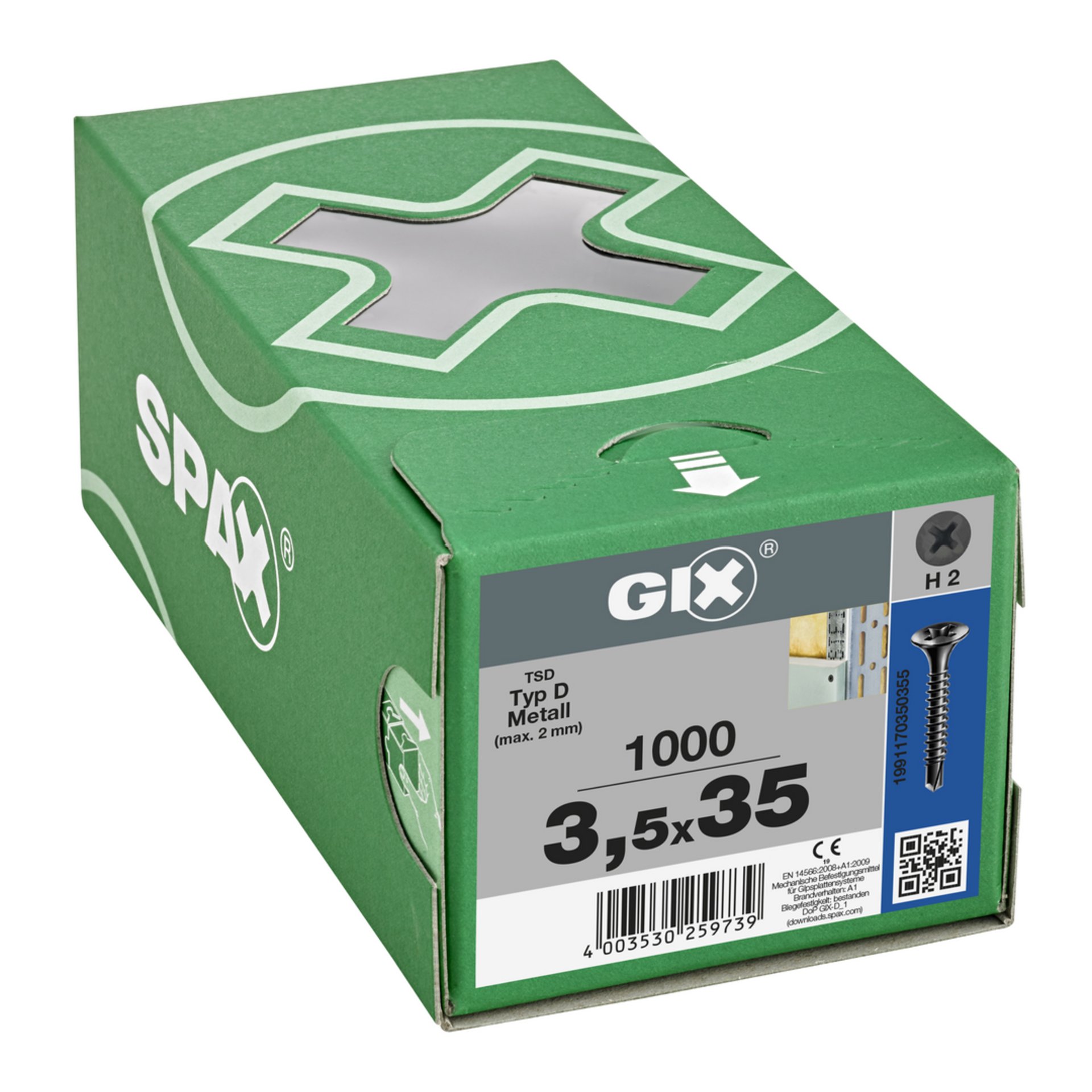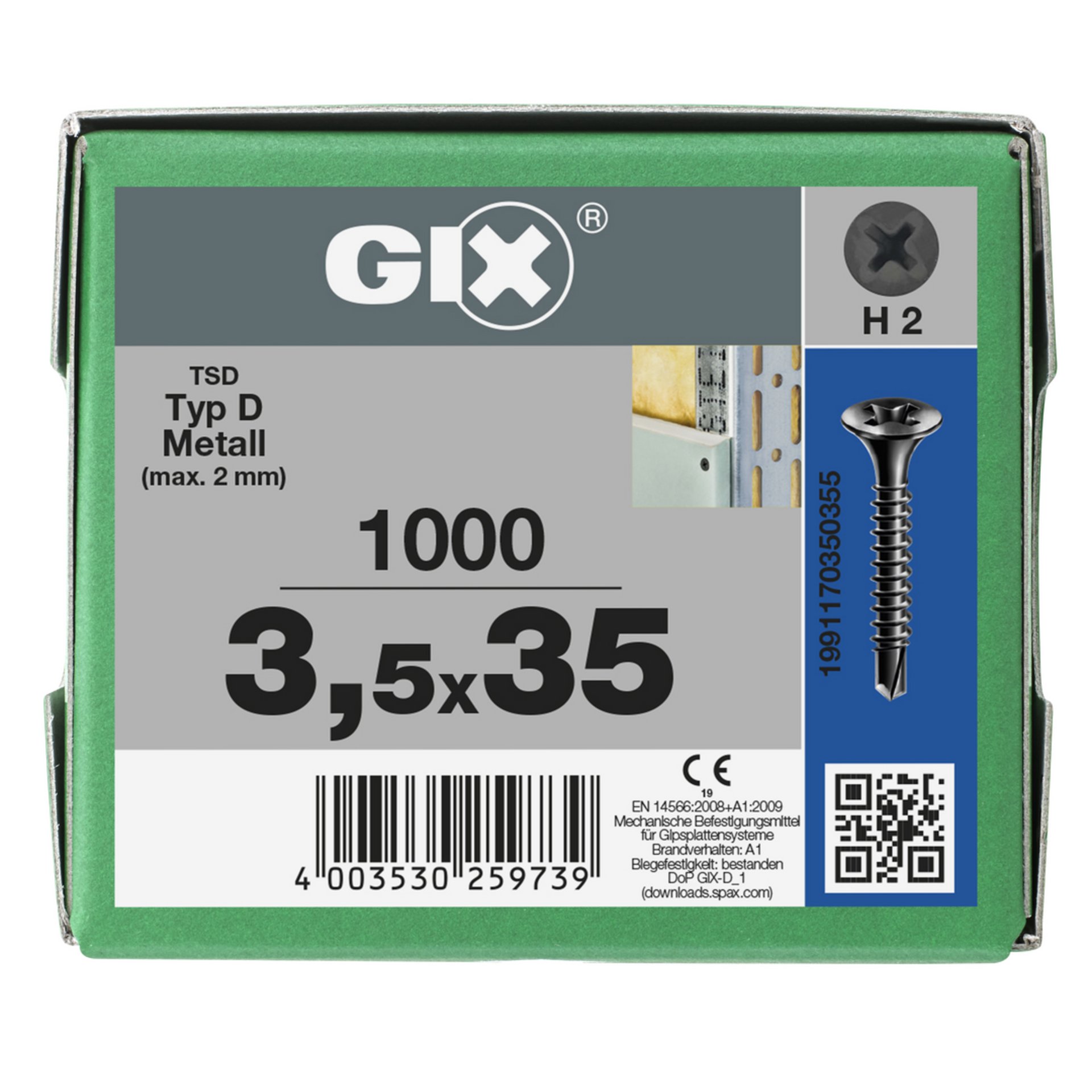 Eigenschaften "SPAX GIX-D Bohrspitze, 3,5 x 35 mm, 1000 Stück, Vollgewinde, Trompetenkopf, Kreuzschlitz H2, Bohrspitze, Phosphatiert schwarz"