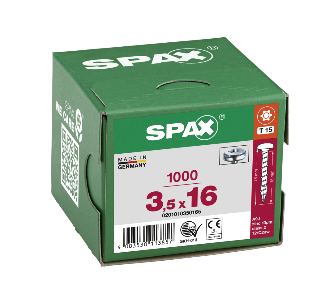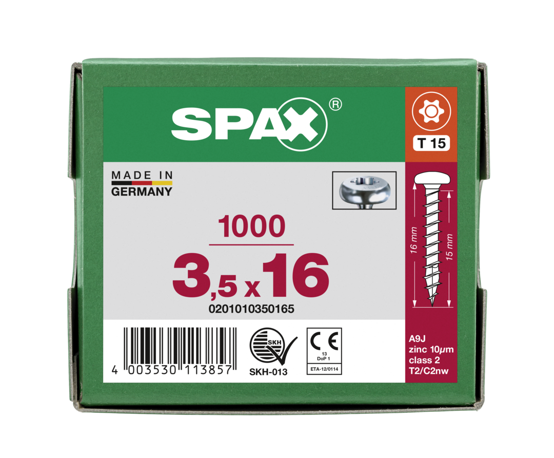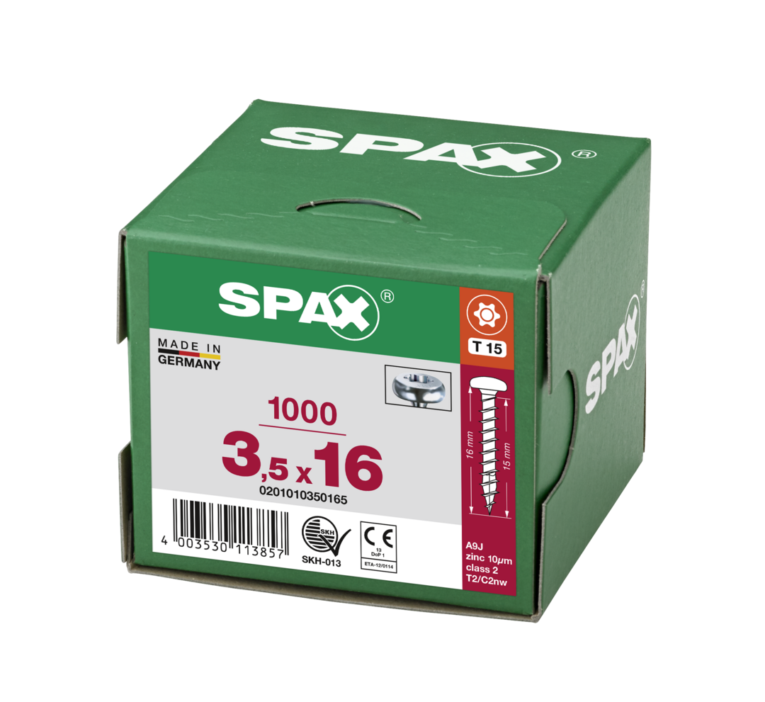 Eigenschaften "SPAX Universalschraube, 3,5 x 16 mm, 1000 Stück, Vollgewinde, Halbrundkopf, T-STAR plus T15, 4CUT, WIROX"