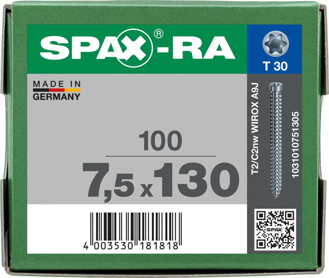 Eigenschaften "SPAX SPAX-RA, 7,5 x 130 mm, 100 Stück, Vollgewinde, Zylinderkopf, T-STAR plus T30, WIROX"