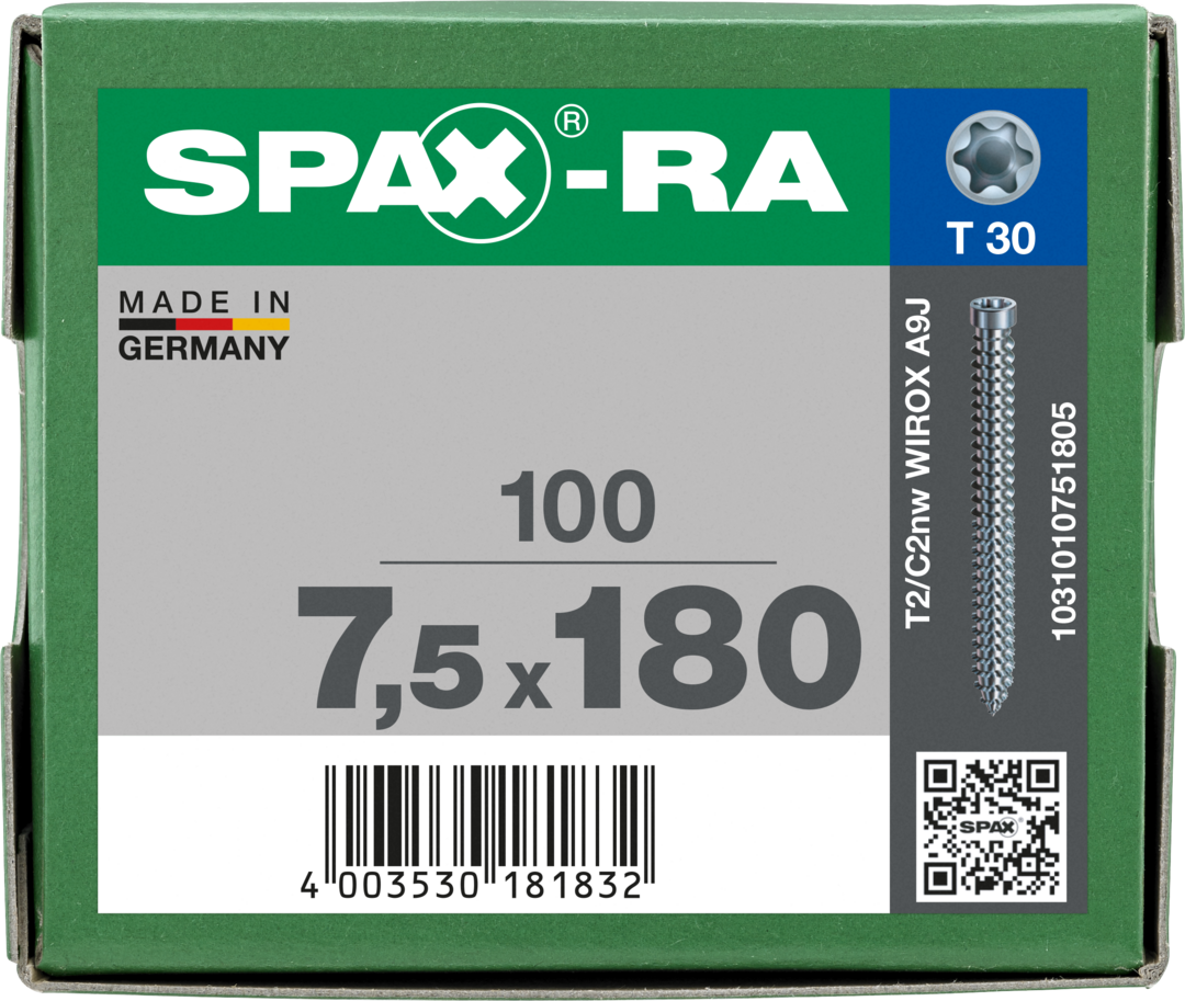 Eigenschaften "SPAX SPAX-RA, 7,5 x 180 mm, 100 Stück, Vollgewinde, Zylinderkopf, T-STAR plus T30, WIROX"