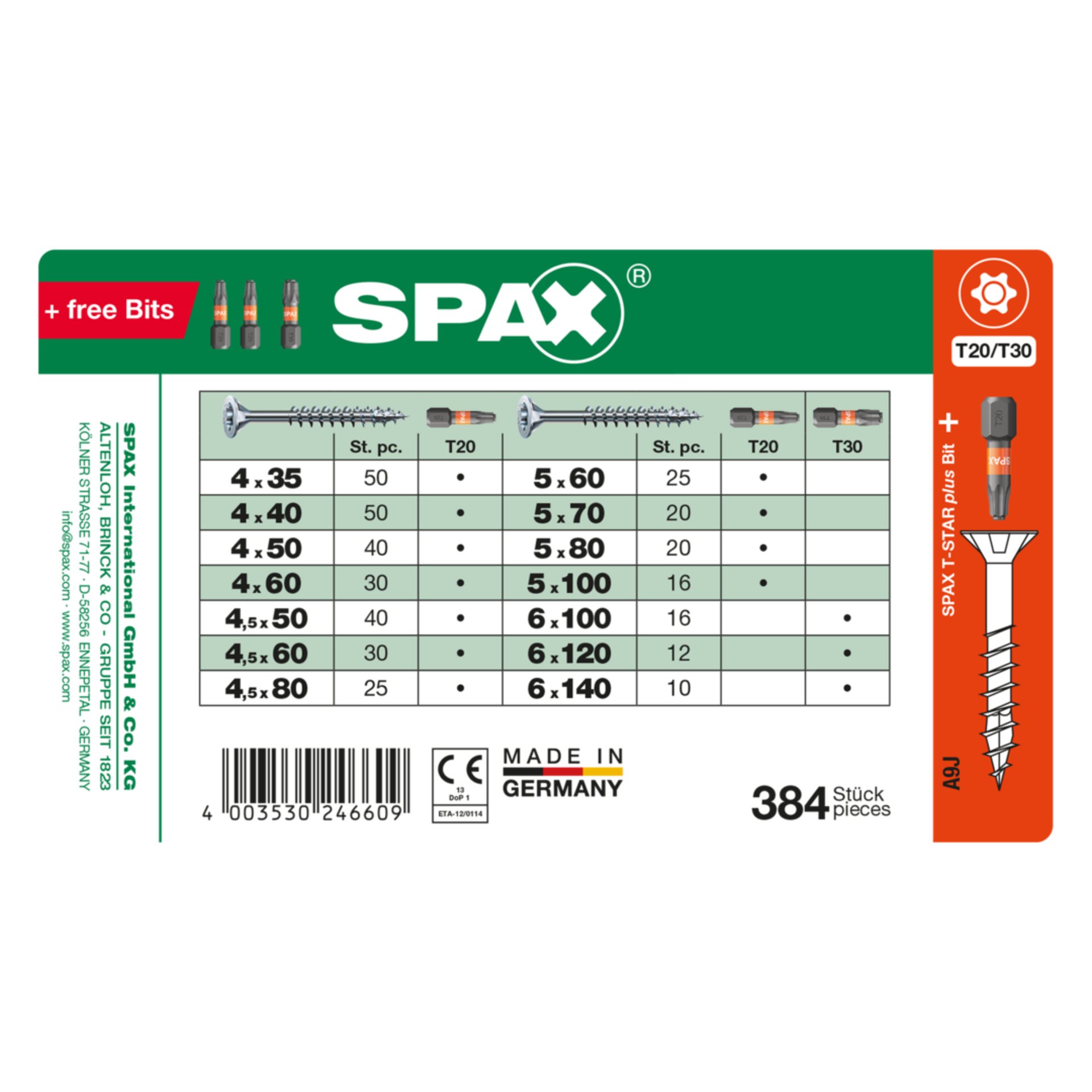 Eigenschaften "SPAX Sortiment Koffer, Schrauben-Set mit 14 Abmessungen, 384 Schrauben + 3 Bits, Senkkopf, T-STAR plus, WIROX"