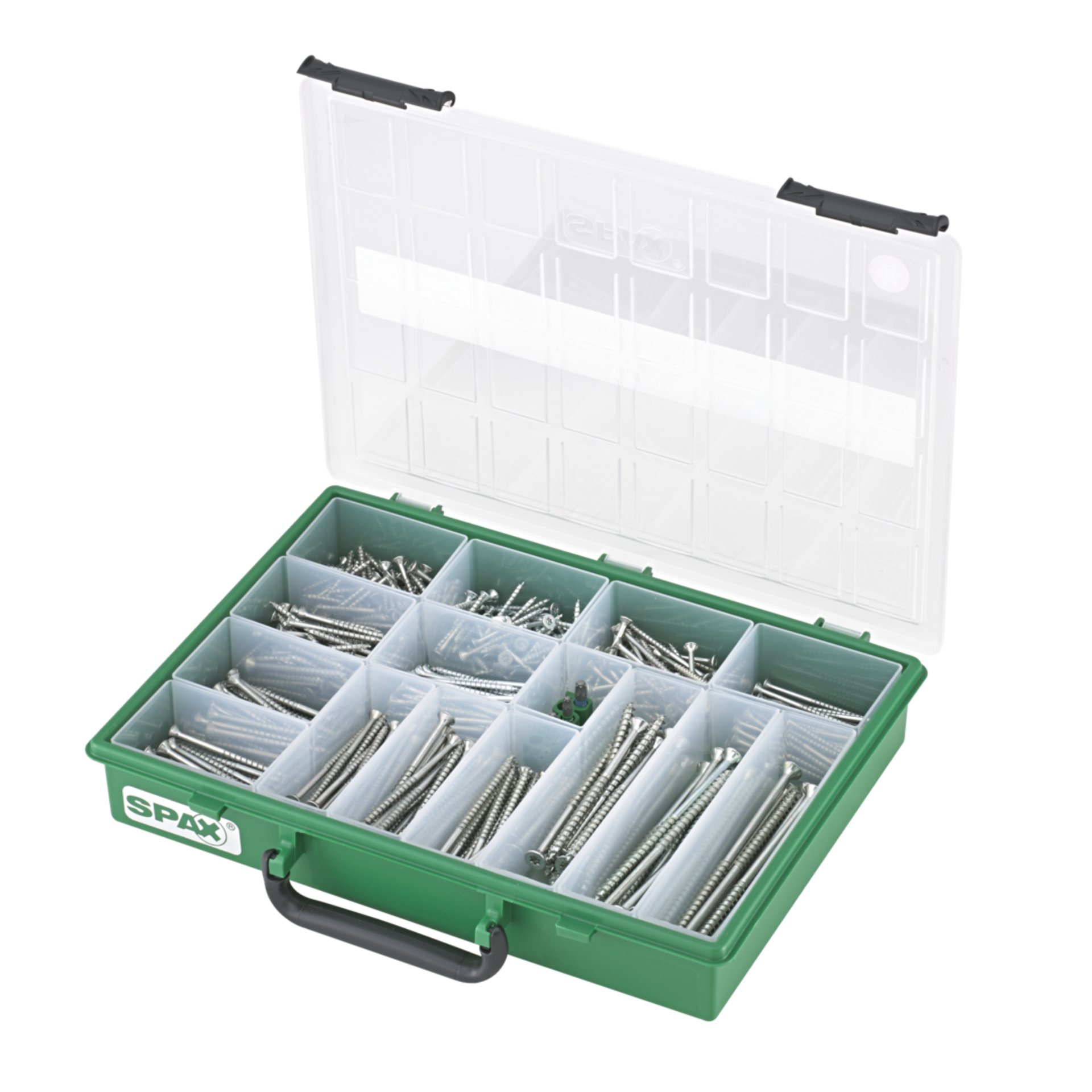 Produktinformationen "SPAX Sortiment Koffer, Schrauben-Set mit 14 Abmessungen, 384 Schrauben + 3 Bits, Senkkopf, T-STAR plus, WIROX"