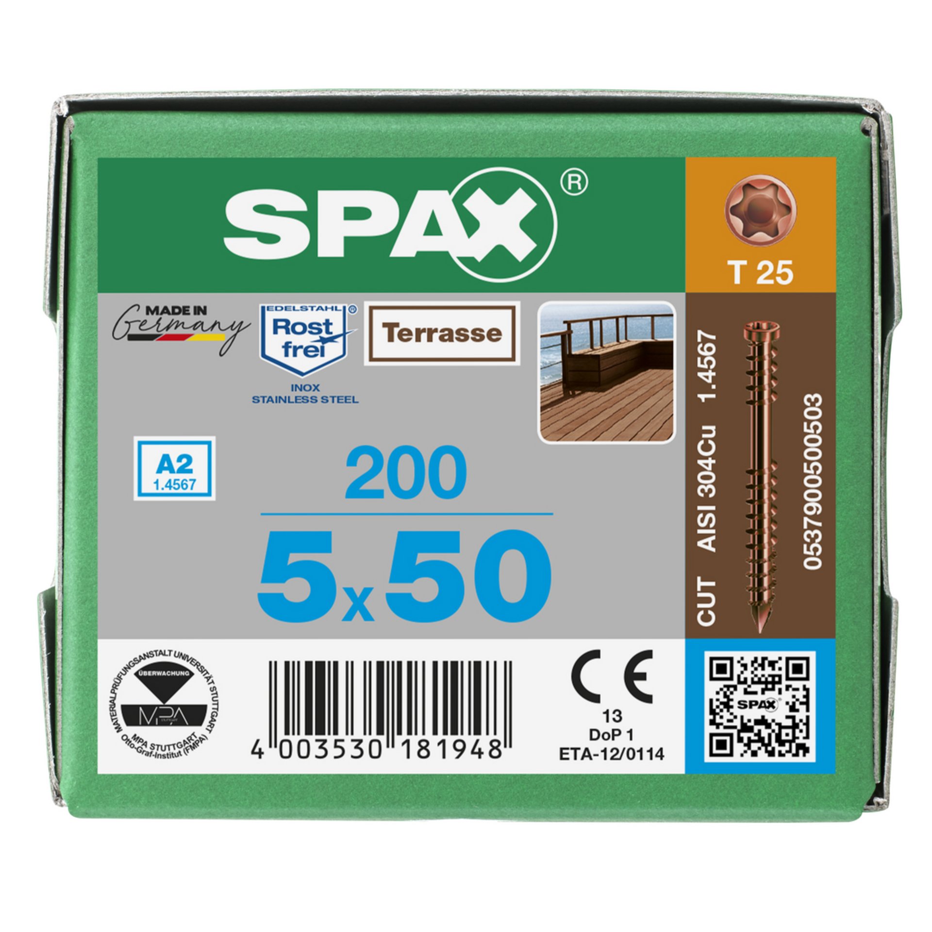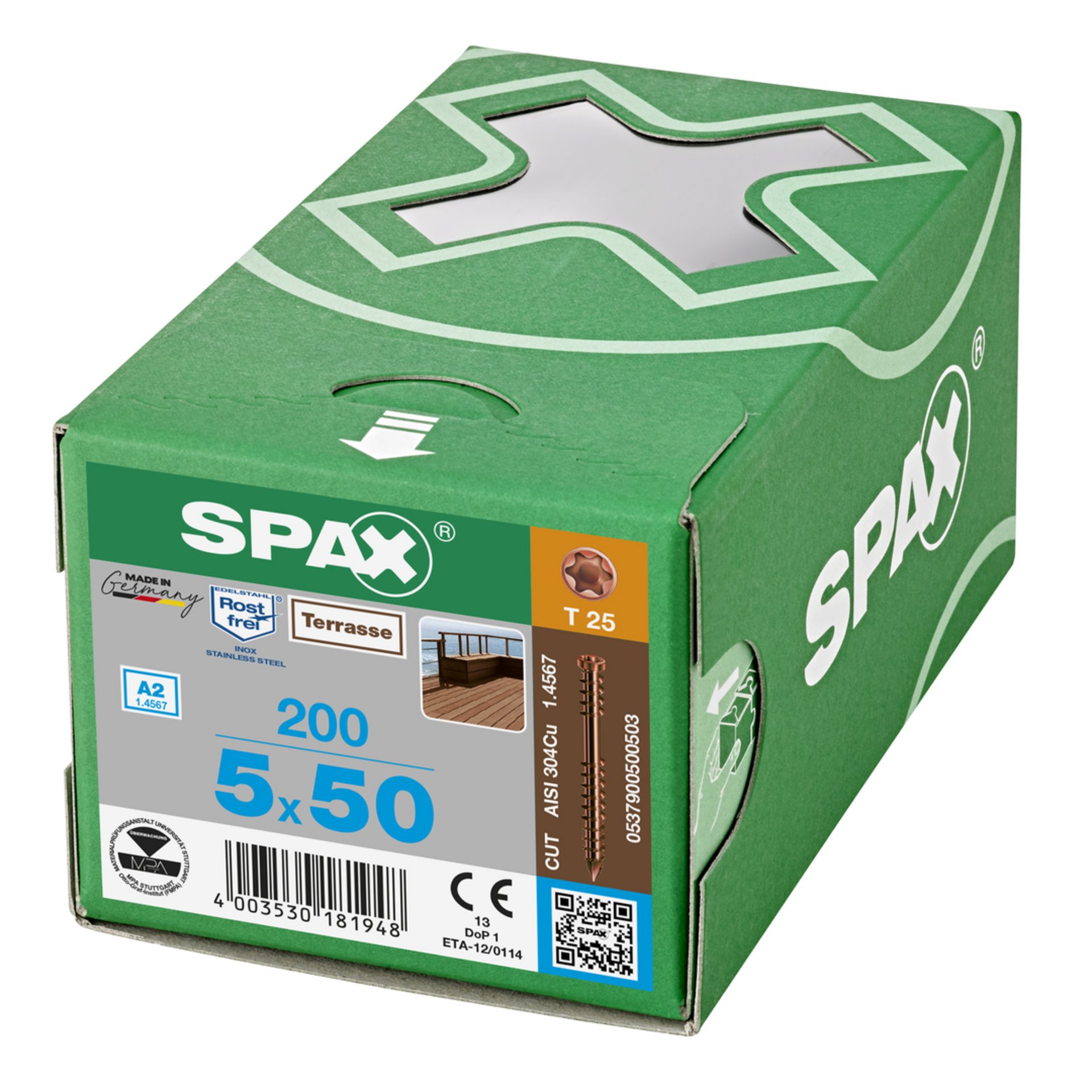 SPAX Terrassenschraube, 5 x 50 mm, 200 Stück, Fixiergewinde, Zylinderkopf, T-STAR plus T25, CUT-Spitze, Edelstahl rostfrei A2 antik