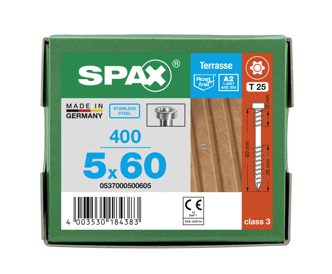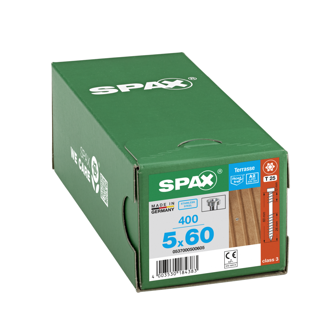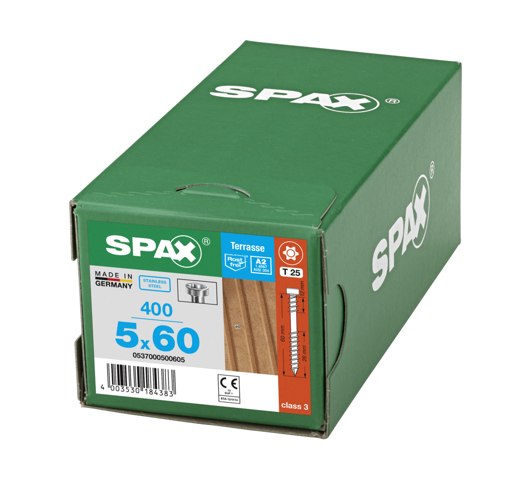 Variante: | SPAX Terrassenschraube, 5 x 60 mm, Fixiergewinde, Zylinderkopf, T-STAR plus, CUT-Spitze, Edelstahl rostfrei A2 |