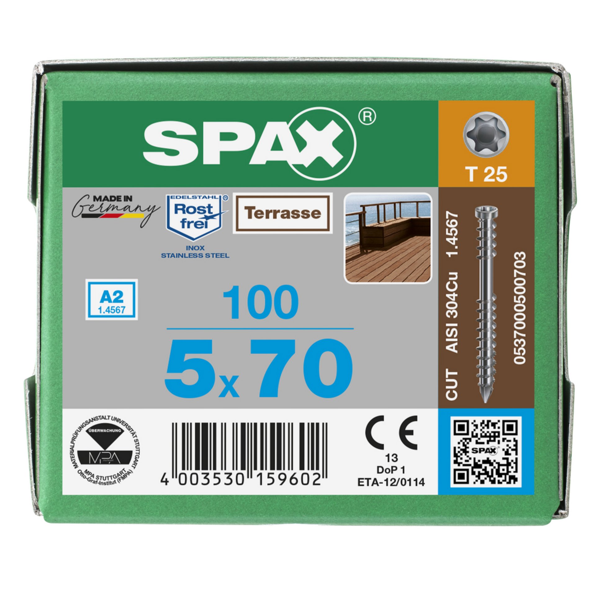 | Variante: | SPAX Terrassenschraube, 5 x 70 mm, 100 Stück, Fixiergewinde, Zylinderkopf, T-STAR plus T25, CUT-Spitze, Edelstahl rostfrei A2 - 0537000500703 |