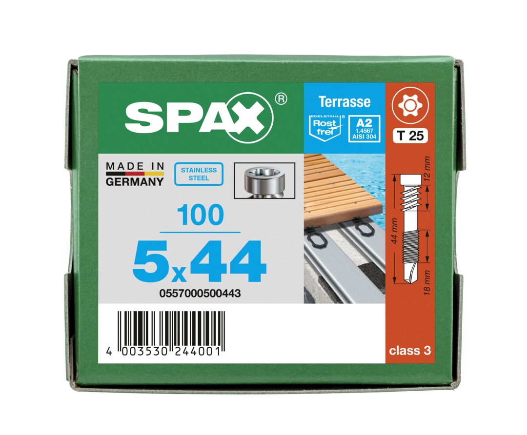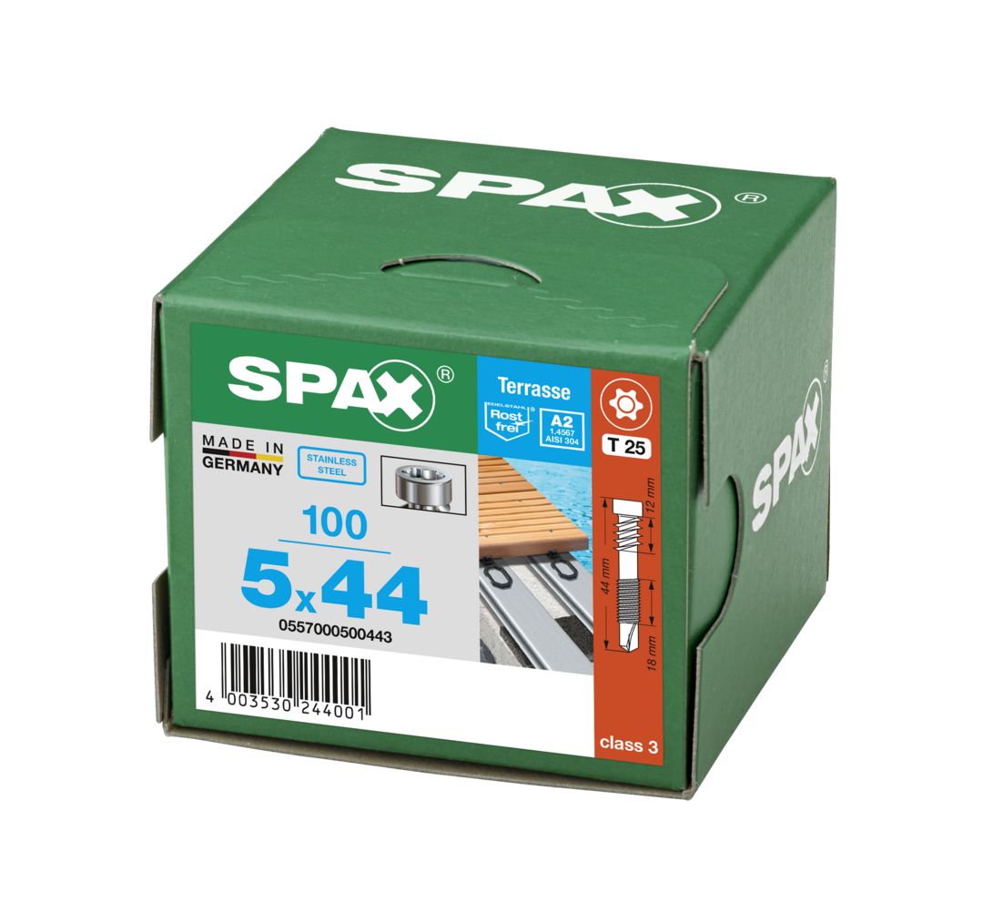 | Variante: | SPAX Terrassenschraube Alu, 5 x 44 mm, 100 Stück, Fixiergewinde, Zylinderkopf, T-STAR plus T25, Bohrspitze, Edelstahl rostfrei A2 - 0557000500443 |