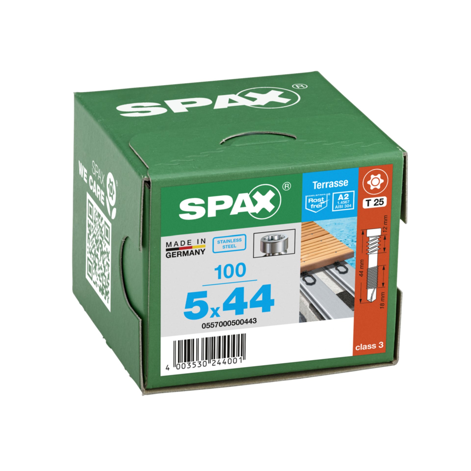 SPAX Terrassenschraube Alu, 5 x 44 mm, 100 Stück, Fixiergewinde, Zylinderkopf, T-STAR plus T25, Bohrspitze, Edelstahl rostfrei A2