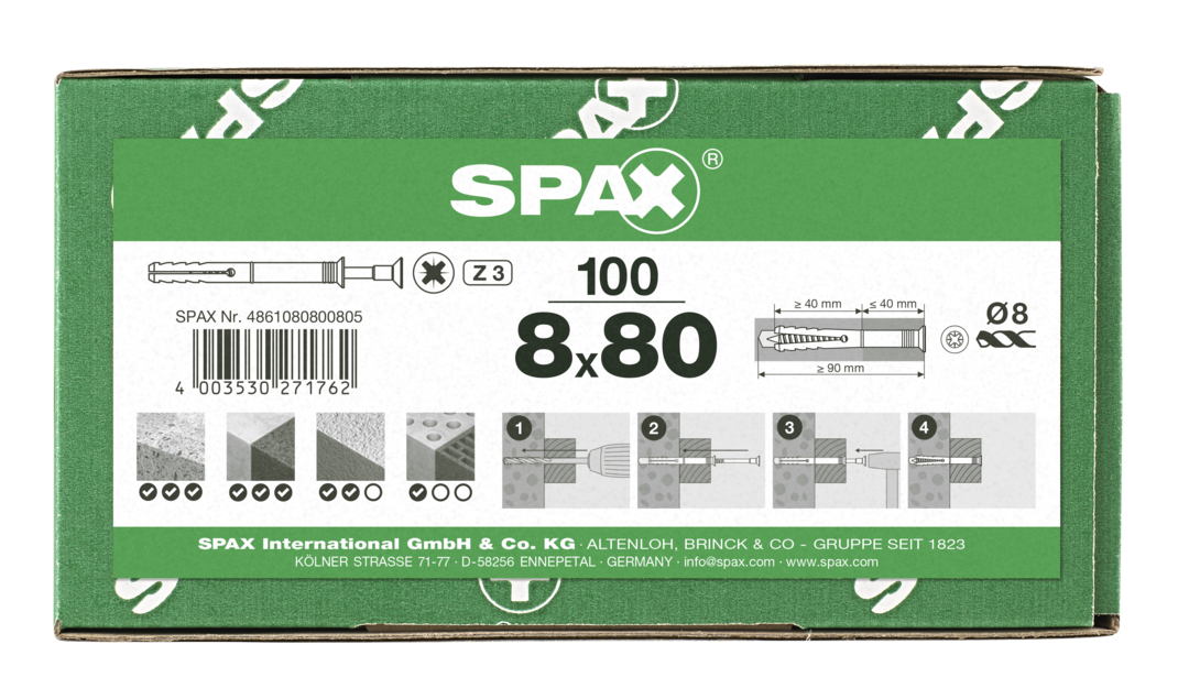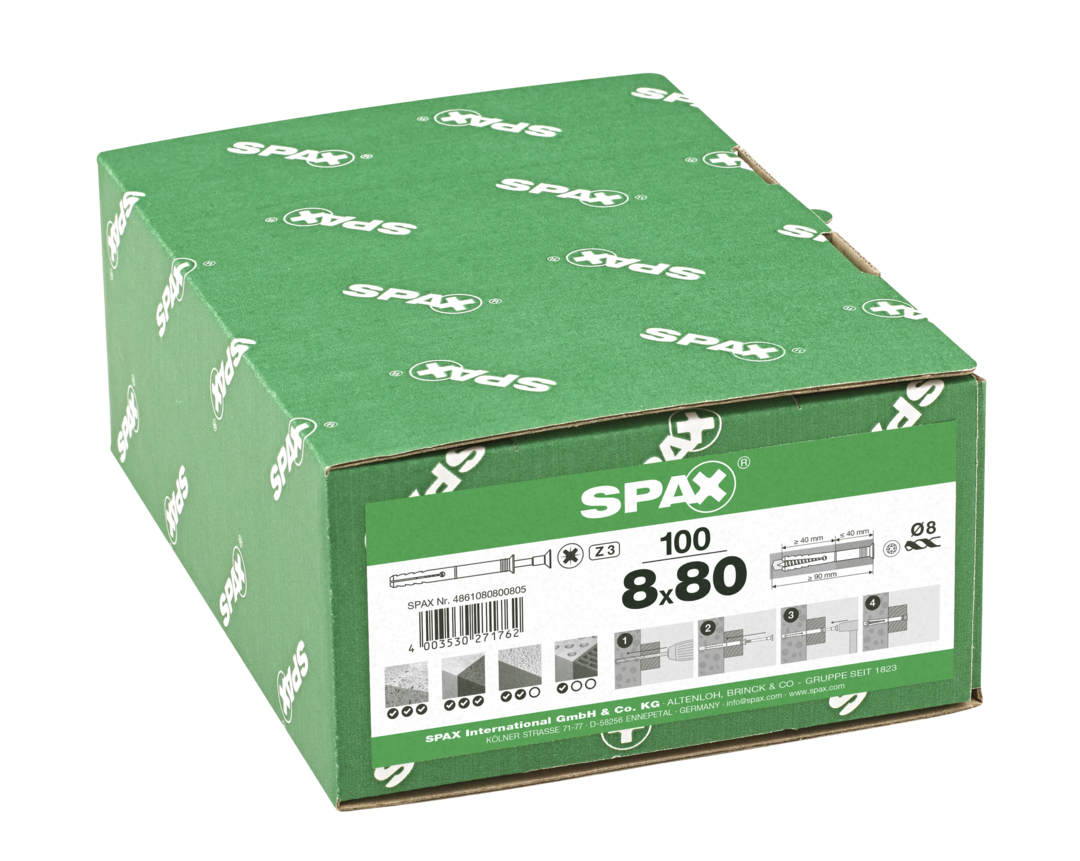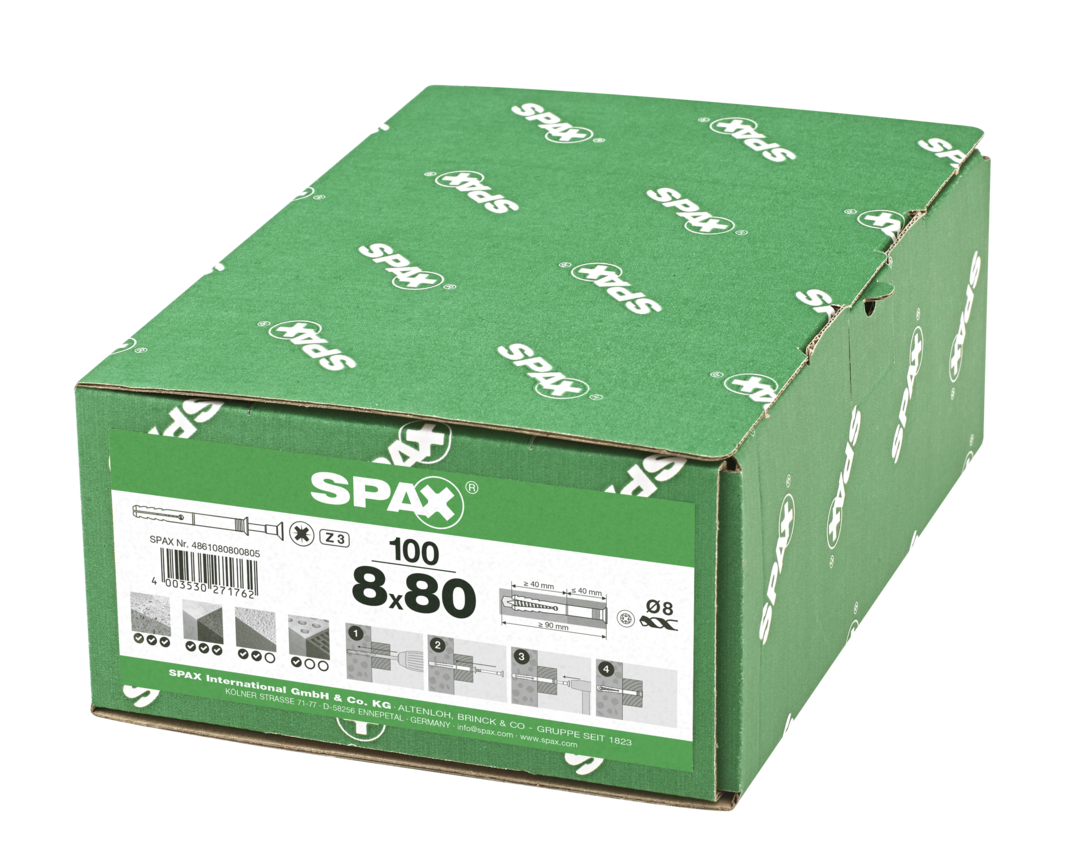 | Variante: | SPAX Typ-ND, Nageldübel 8 x 80 mm, 100 Stück - 4861080800805 |