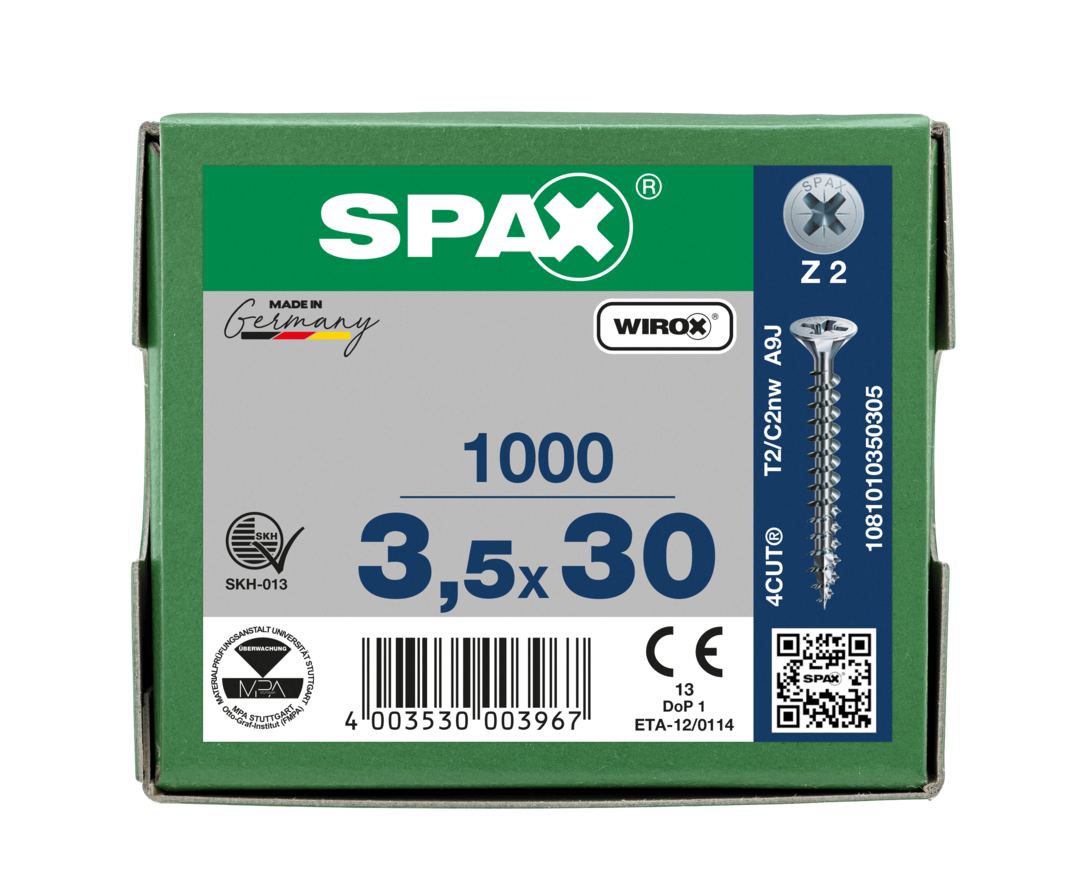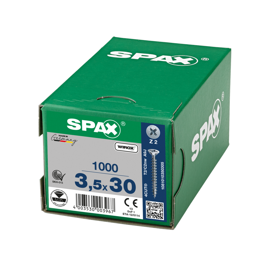 Eigenschaften "SPAX Universalschraube, 3,5 x 30 mm, 1000 Stück, Vollgewinde, Senkkopf, Kreuzschlitz Z2, 4CUT, WIROX"