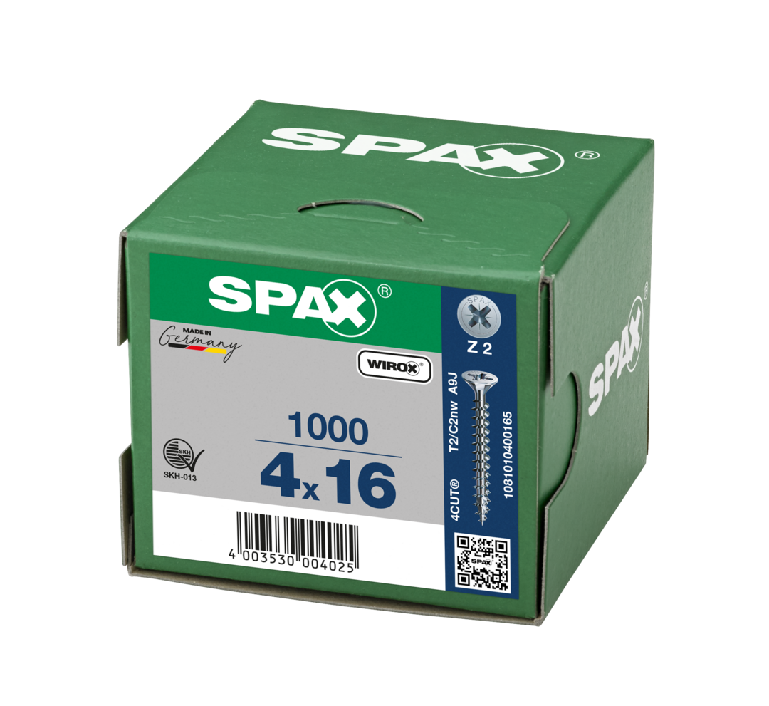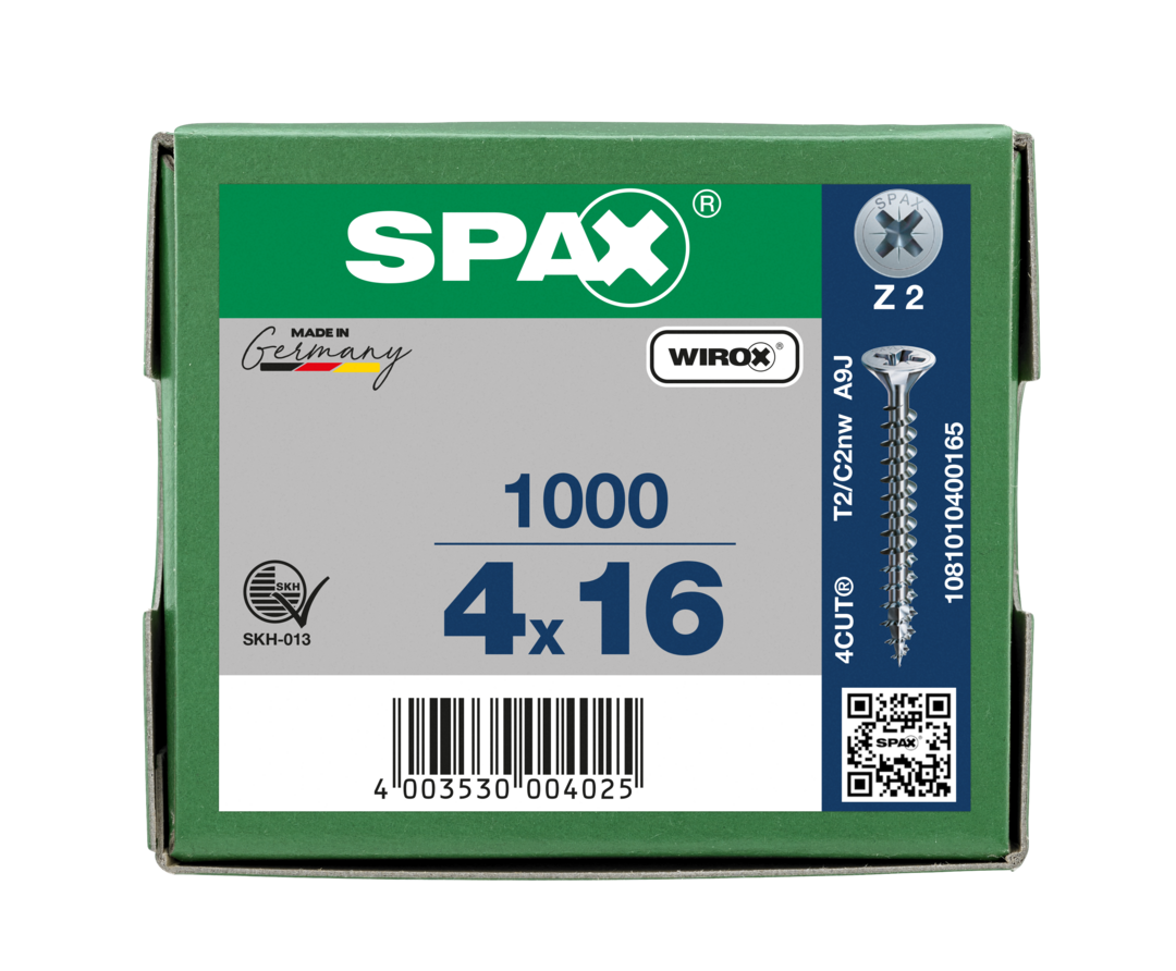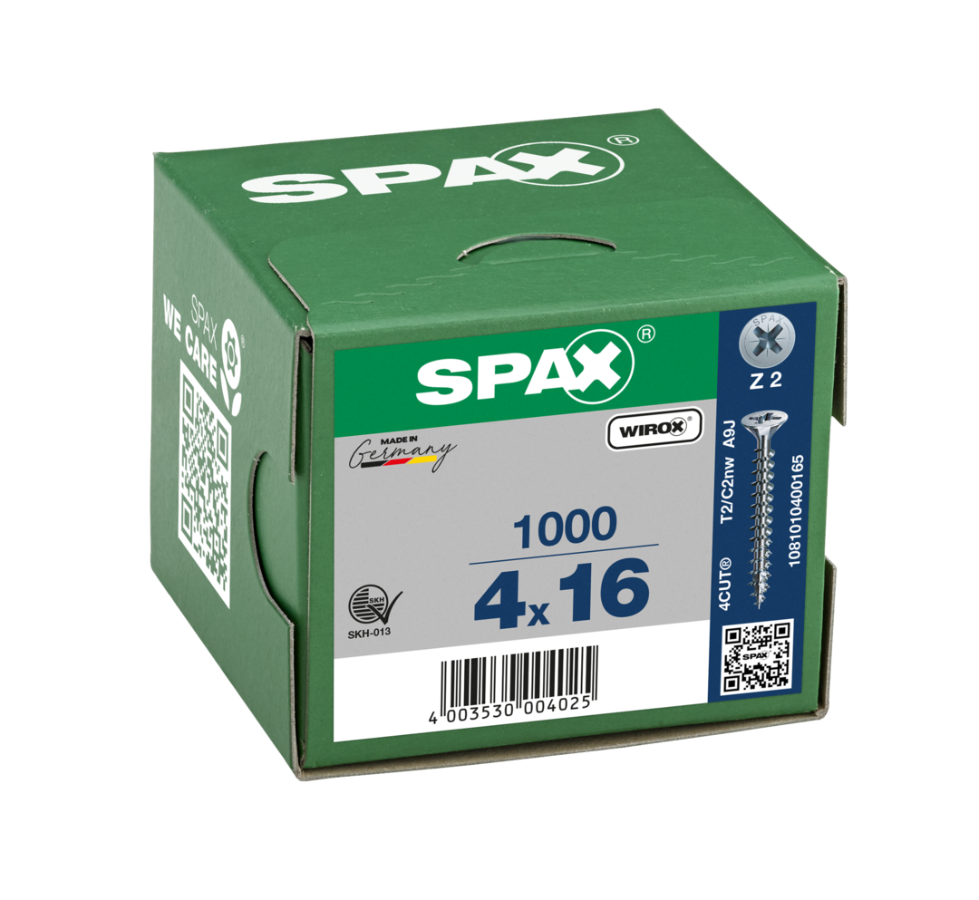 Eigenschaften "SPAX Universalschraube, 4 x 16 mm, 1000 Stück, Vollgewinde, Senkkopf, Kreuzschlitz Z2, 4CUT, WIROX"