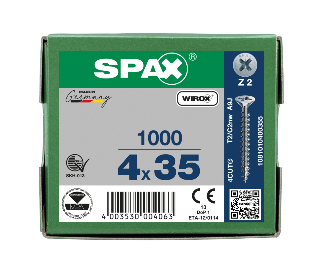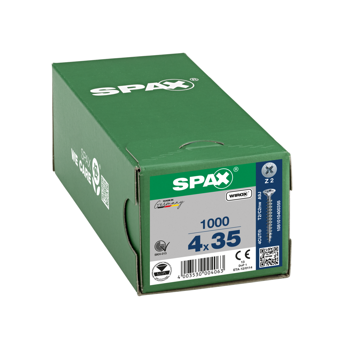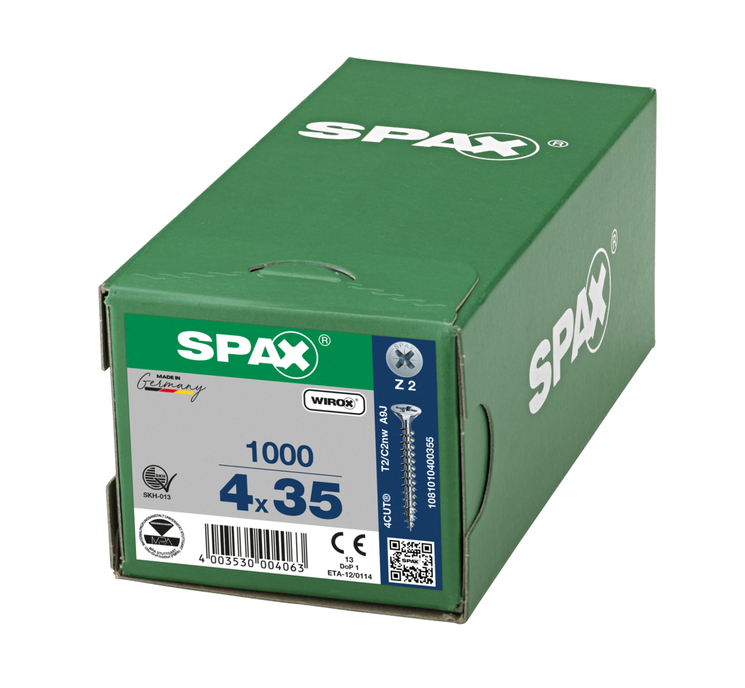 Eigenschaften "SPAX Universalschraube, 4 x 35 mm, 1000 Stück, Vollgewinde, Senkkopf, Kreuzschlitz Z2, 4CUT, WIROX"