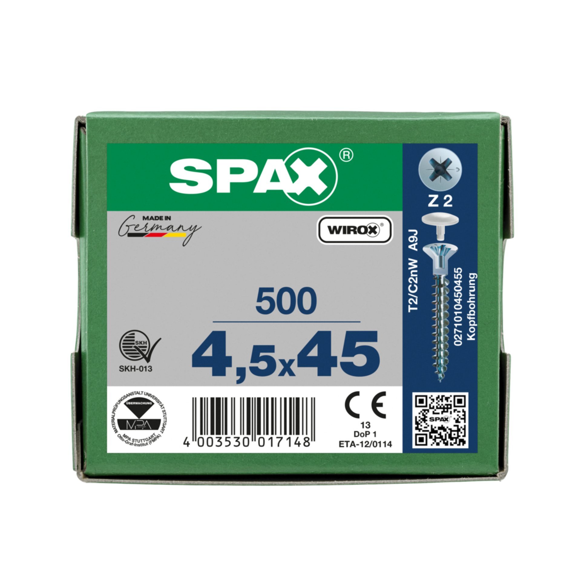 SPAX Universalschraube mit Kopfbohrung, 4,5 x 45 mm, 500 Stück, Vollgewinde, Senkkopf, Kreuzschlitz Z2, S-Spitze, WIROX