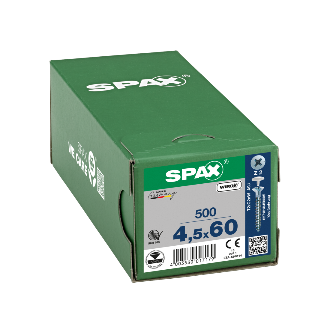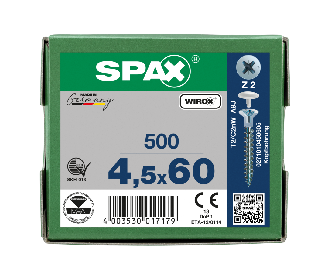 Eigenschaften "SPAX Universalschraube mit Kopfbohrung, 4,5 x 60 mm, 500 Stück, Vollgewinde, Senkkopf, Kreuzschlitz Z2, S-Spitze, WIROX"