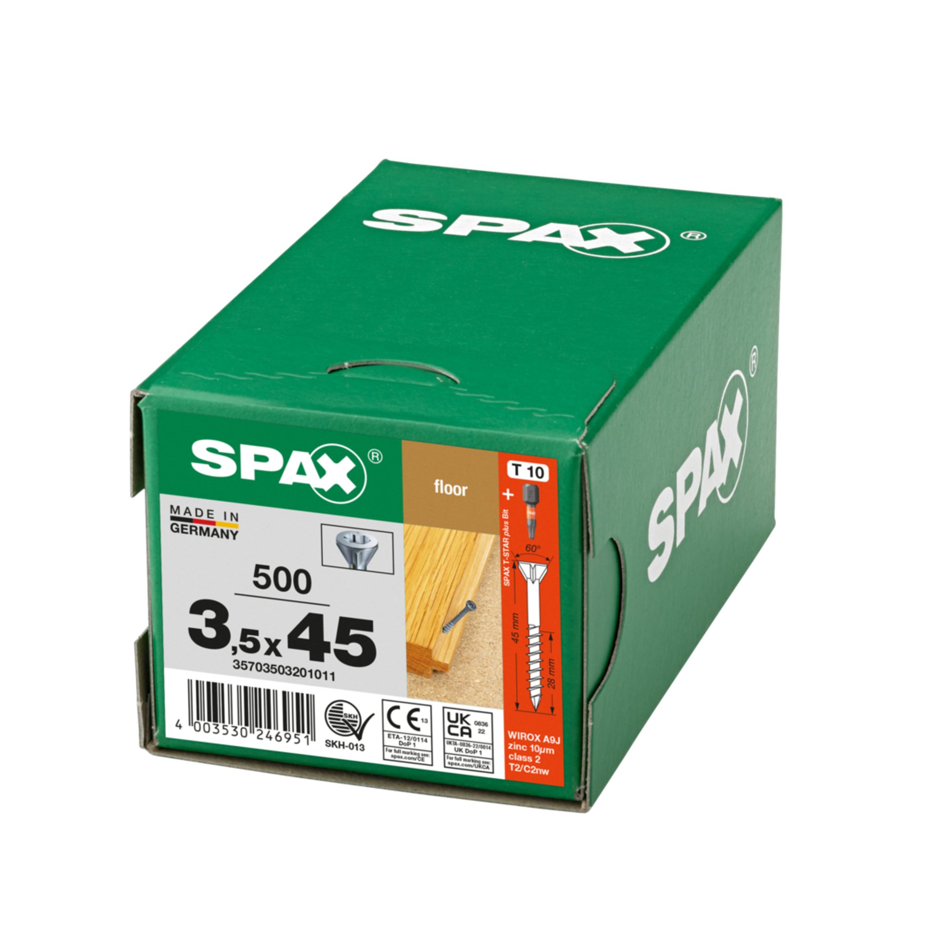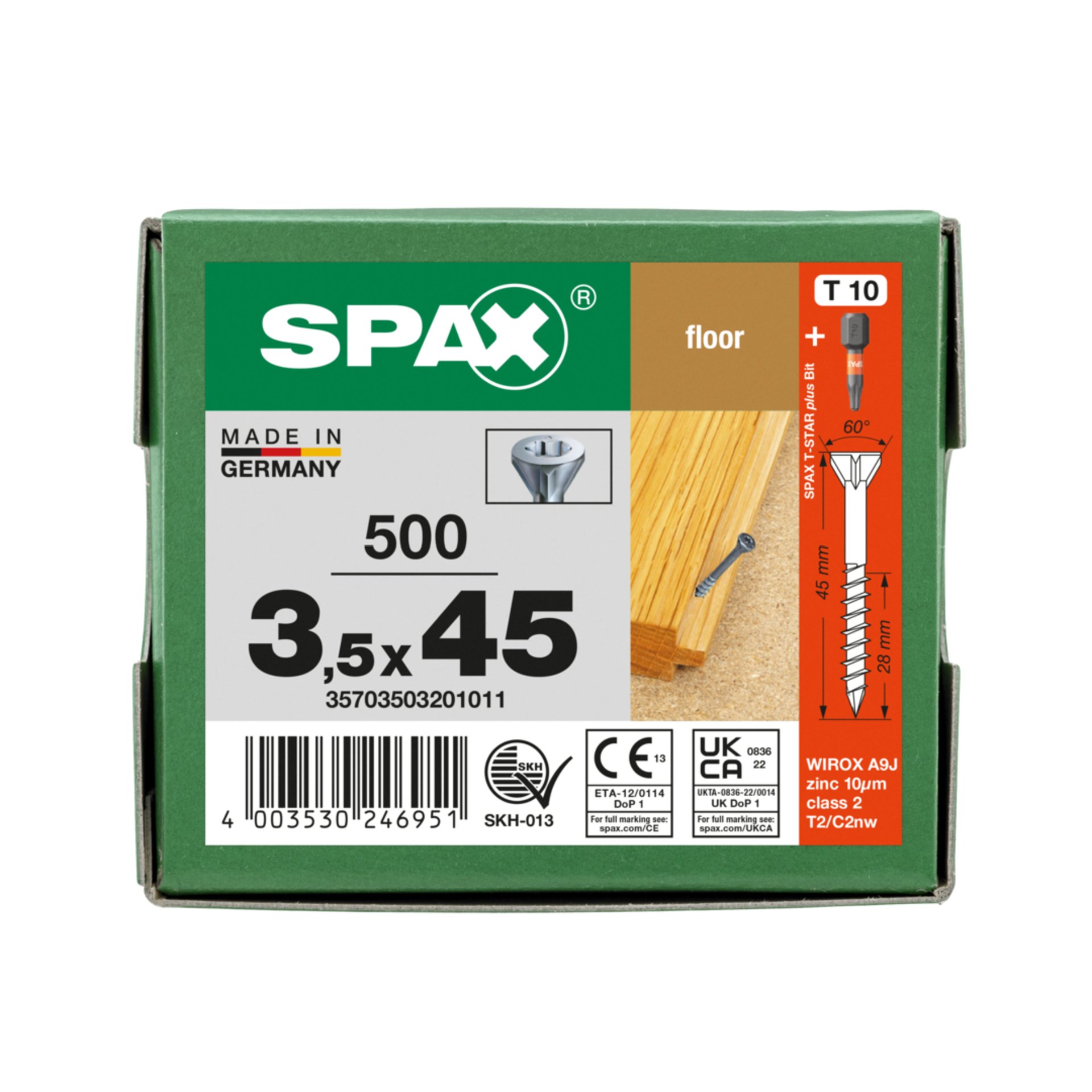 Eigenschaften "SPAX für Massivholz-Fußböden, 3,5 x 45 mm, 500 Stück, Teilgewinde, Senkkopf, T-STAR plus T10, CUT-Spitze, WIROX"