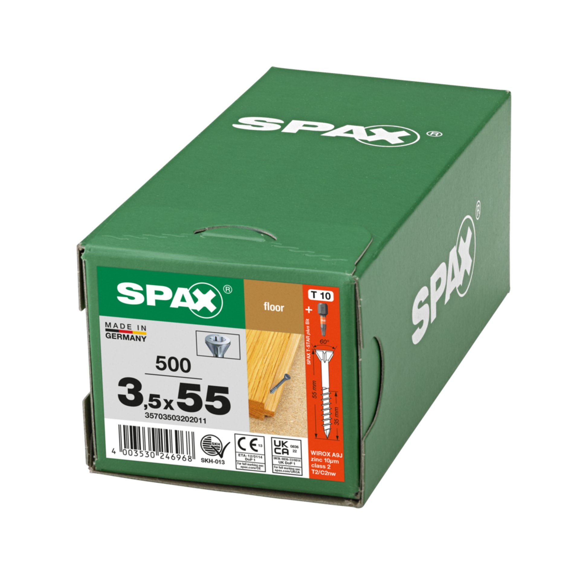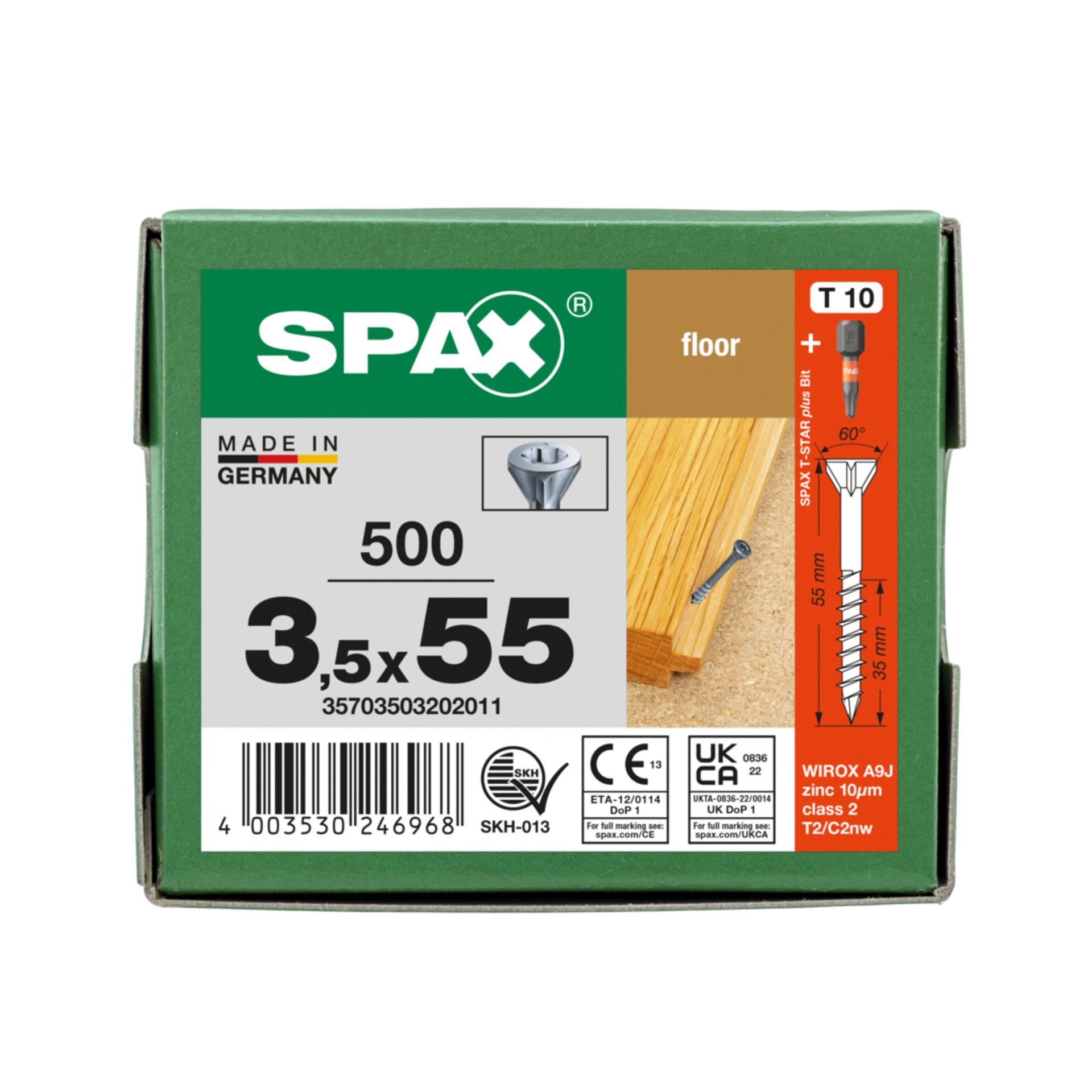 Eigenschaften "SPAX für Massivholz-Fußböden, 3,5 x 55 mm, 500 Stück, Teilgewinde, Senkkopf, T-STAR plus T10, CUT-Spitze, WIROX"