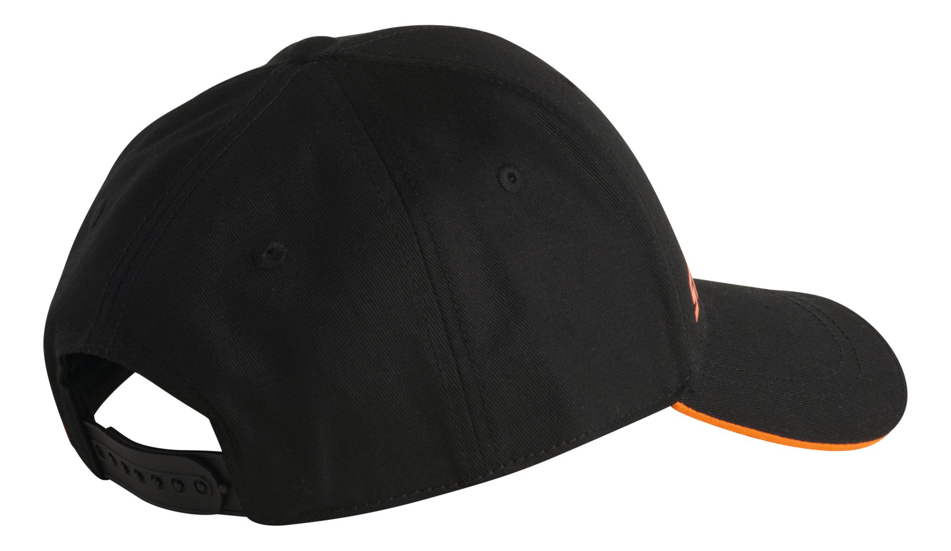 Schwarze Cap mit geformtem Visier, mit stylischen orangen Details wie dem STIHL Schriftzug auf der Front, einer kleinen Jahreszahl auf der Rückseite sowie der »LEGENDARY PERFORMANCE«-Zeile an der Seite.