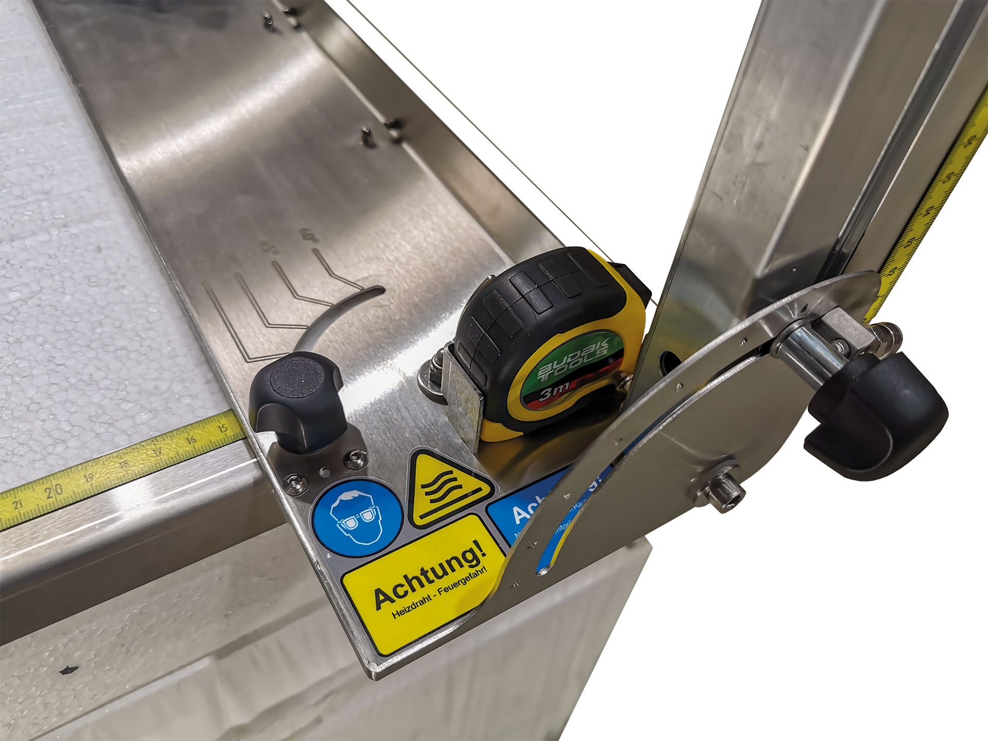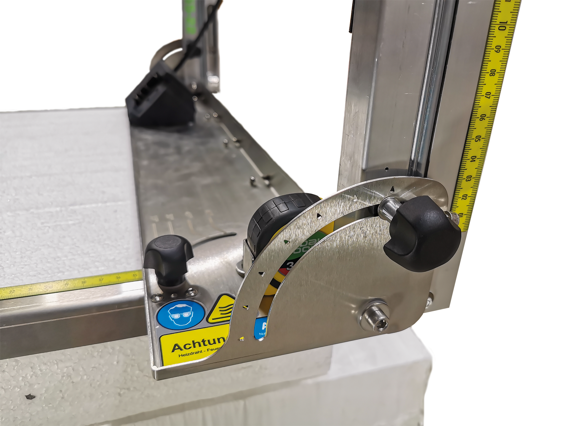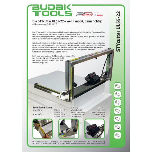 Die STYcutter UL55-22 wurde entwickelt, um die gängigsten Schnitte bei der Fassadenverkleidung zu ermöglichen und dennoch handlich und mobil zu sein. Mit ihrem Gesamtgewicht von 3,9kg (ohne Akku) und ihren Maßen, kaum größer als ein Aktenkoffer, ist sie mobil und in kürzester Zeit einsatzbereit. Kabellose Freiheit sorgt für freie Verkehrswege und verminderte Unfallgefahren auf dem Gerüst. Geschnitten wird direkt auf Ihrem Material (Styroporstapel), damit kostbarer Platz auf dem Gerüst nicht verschwendet wird. Um das Anschneiden der nächsten Platte des Styroporstapels zu verhindern und wiederkehrende Nutenschnitte zu ermöglichen, kann die Schnitttiefe mittels Anschlag begrenzt werden. Dank des abnehmbaren Rollbandmaßes, messen Sie Ihre Schnitte für die STYcutter UL55-22 und haben darüber hinaus stets ein Meßwerkzeug parat.